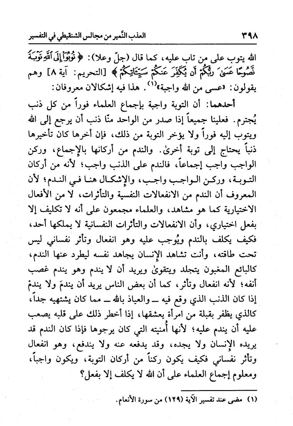 أحدُهما: أن التوبةَ واجبةٌ بإجماعِ العلماءِ فَوْرًا من كُلِّ ذَنْبٍ يُجْتَرَمُ. فعلينا جميعًا إذا صَدَرَ من الواحدِ مِنَّا ذنبٌ أن يرجعَ إلى اللَّهِ ويتوبَ إليه فورًا ولا يؤخرَ التوبةَ من ذلك، فإن أَخَّرَهَا كان تأخيرُها ذَنْبًا يحتاجُ إلى توبةٍ أخرى. والندمُ من أركانِها بالإجماعِ، وركنُ الواجبِ واجبٌ إجماعًا، فالندمُ على الذنبِ واجبٌ؛ لأنه من أركانِ التوبةِ، وركنُ الواجبِ واجبٌ، والإشكالُ هنا في الندمِ؛ لأن المعروفَ أن الندمَ من الانفعالاتِ النفسيةِ والتأثراتِ، لا من الأفعالِ الاختياريةِ كما هو مُشَاهَدٌ، والعلماءُ مُجْمِعُونَ على أنه لا تكليفَ إلا بفعلٍ اختياريٍّ، وأن الانفعالاتِ والتأثراتِ النفسانيةَ لا يَمْلُكُهَا أَحَدٌ، فكيف يُكَلَّفُ بالندمِ ويُوجِبُ عليه وهو انفعالٌ وتأثرٌ نَفْسَانِيٌّ ليسَ تحتَ طاقتِه، وأنتَ تُشَاهِدُ الإنسانَ يُجَاهِدُ نفسَه ليطردَ عنها الندمَ، كالبائعِ المغبونِ يتجلدُ وَيَتَقَوَّى ويريدُ أن لا يندمَ وهو يندمُ غَصْبَ أَنْفِهِ؛ لأنه انفعالٌ وتأثرٌ، كما أن بعضَ الناسِ يريدُ أن يَنْدَمَ ولا يندمُ إذا كان الذنبُ الذي وَقَعَ فيه - والعياذُ بالله - مِمَّا كان يَشْتَهِيهِ جِدًّا، كالذي يظفرُ بِقُبْلَةٍ من امرأةٍ يعشقُها، إذا أخطرَ ذلك على قلبِه يصعبُ عليه أن يندمَ عليه؛ لأنها أُمْنِيَتُهُ التي كان يرجوها فإذا كان الندمُ قد يريدُه الإنسانُ ولا يَجِدُهُ، وقد يدفعُه عنه ولا يندفعُ، وهو انفعالٌ وتأثرٌ نفسانيٌّ فكيف يكونُ ركنًا من أركانِ التوبةِ، ويكونُ واجبًا، ومعلومٌ إجماعُ العلماءِ على أن اللَّهَ لاَ يُكَلِّفُ إلا بِفِعْلٍ؟