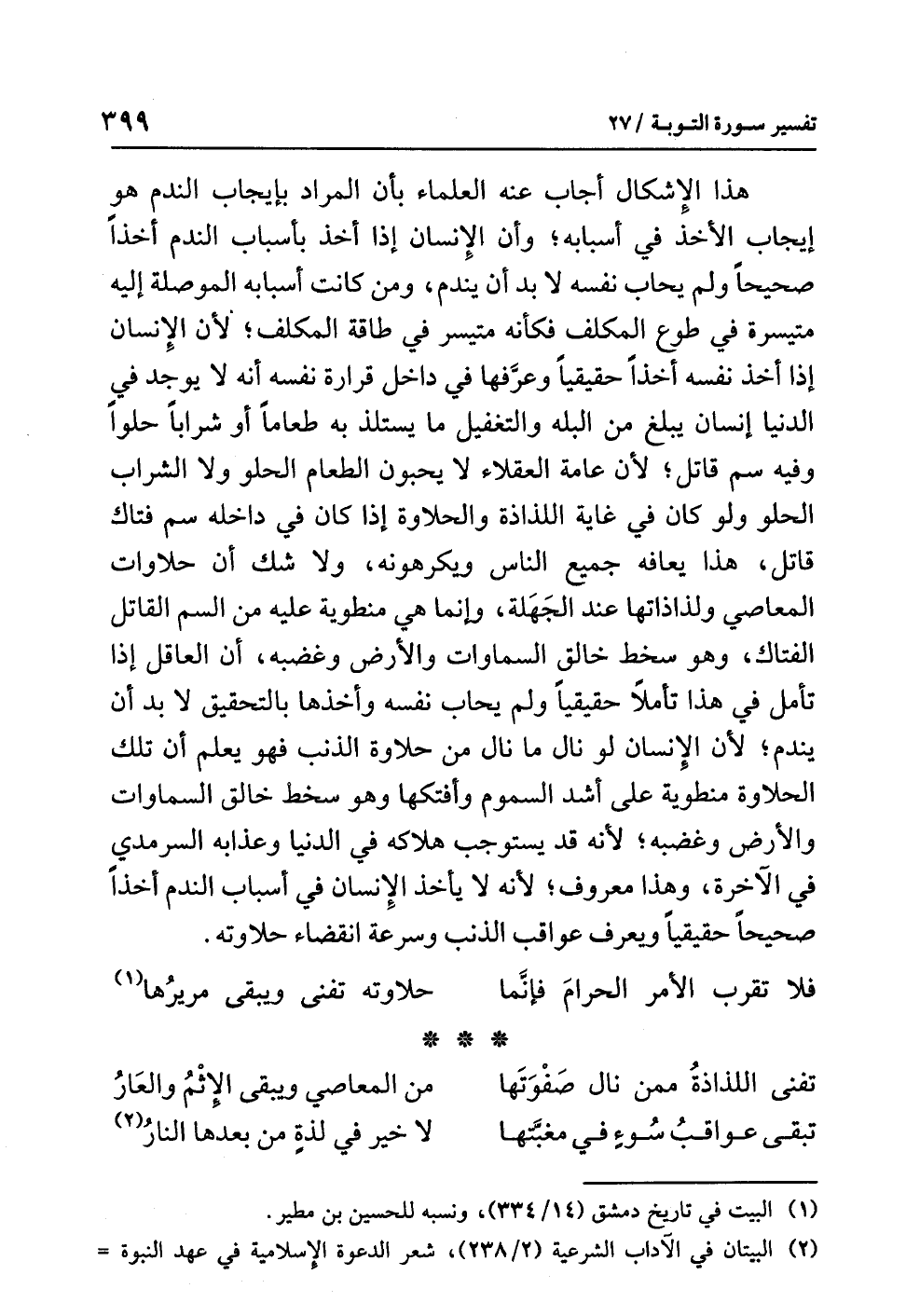 فَلاَ تَقْرَبِ الأَمْرَ الْحَرَامَ فَإِنَّمَا ... حَلاَوَتُهُ تَفْنَى وَيَبْقَى مَرِيرُهَا (¬1)