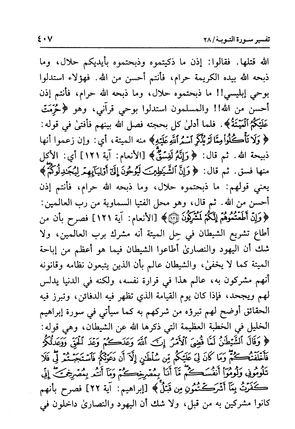 والمسلمونَ استدلوا بوحيٍ قرآنيٍّ، وهو {حُرِّمَتْ عَلَيْكُمُ الْمَيْتَةُ}. فلما أَدْلَى كُلٌّ بحجتِه فَصَلَ اللَّهُ بينهم فَأَفْتَى في قولِه: {وَلاَ تَأْكُلُوا مِمَّا لَمْ يُذْكَرِ اسْمُ اللَّهِ عَلَيْهِ} منه الميتةُ، أي: وإن زَعَمُوا أنها ذبيحةُ اللَّهِ. ثم قال: {وَإِنَّهُ لَفِسْقٌ} [الأنعام: آية 121] أي: الأكلُ منها فِسْقٌ. ثم قال: {وَإِنَّ الشَّيَاطِينَ لَيُوحُونَ إِلَى أَوْلِيَائِهِمْ لِيُجَادِلُوكُمْ} يعني قولَهم: ما ذبحتموه حلالٌ، وما ذبحه اللَّهُ حرامٌ، فأنتم إِذَنْ أحسنُ من اللَّهِ.