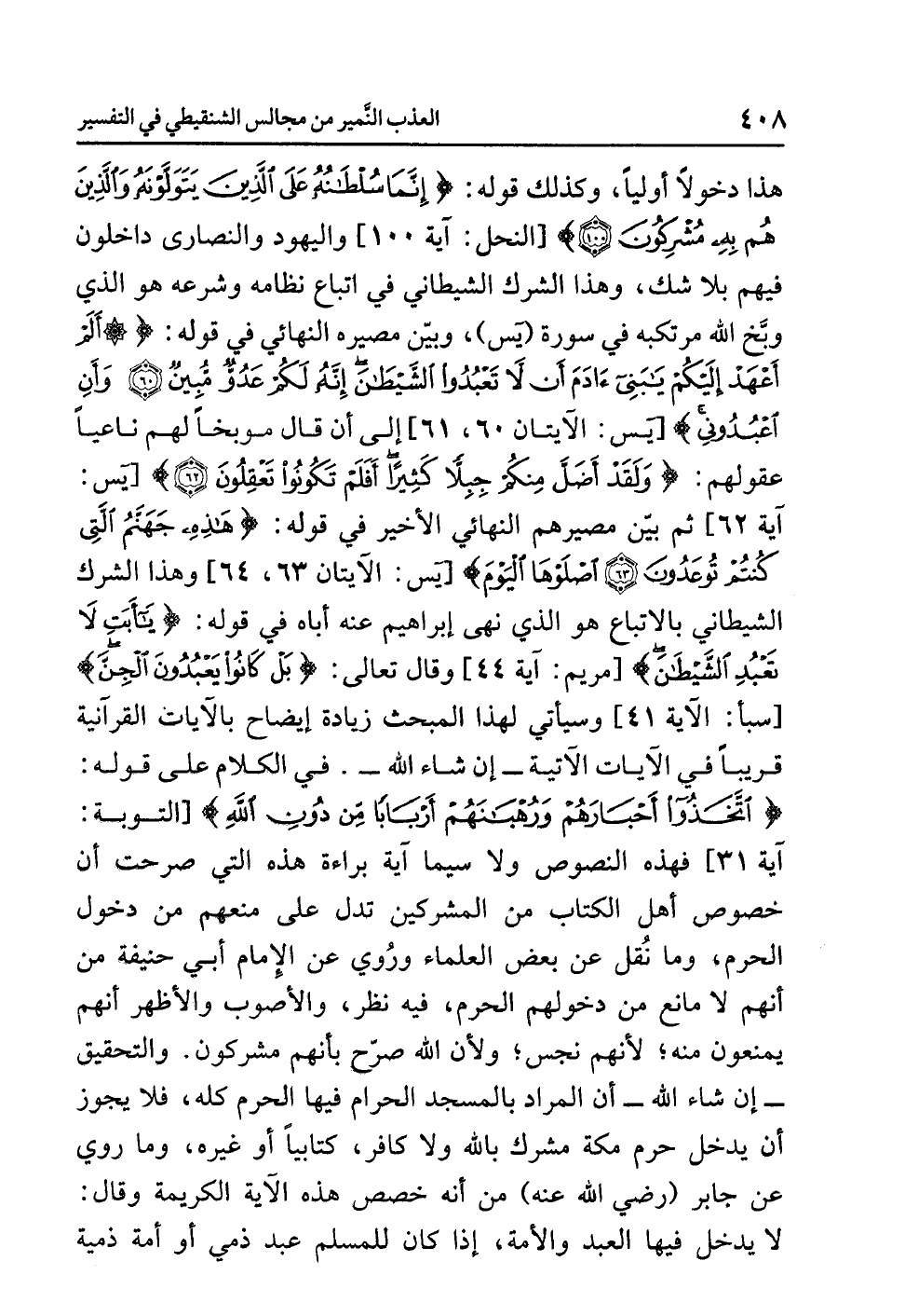 الَّتِي كُنْتُمْ تُوعَدُونَ (63) اصْلَوْهَا الْيَوْمَ} [يس: الآيتان 63، 64] وهذا الشركُ الشيطانيُّ بالاتباعِ هو الذي نَهَى إبراهيمُ عنه أباه في قولِه: {يَا أَبَتِ لاَ تَعْبُدِ الشَّيْطَانَ} [مريم: آية 44] وقال تعالى: {بَلْ كَانُوا يَعْبُدُونَ الْجِنَّ} [سبأ: الآية41] وسيأتِي لهذا المبحثِ زيادةُ إيضاحٍ بالآياتِ القرآنيةِ قريبًا في الآياتِ الآتيةِ - إن شاء اللَّهُ - في الكلامِ على قولِه: {اتَّخَذُوا أَحْبَارَهُمْ وَرُهْبَانَهُمْ أَرْبَابًا مِّنْ دُونِ اللَّهِ} [التوبة: آية 31] فهذه النصوصُ ولا سيما آية براءة هذه التي صَرَّحَتْ أن خصوصَ أهلِ الكتابِ من المشركينَ تَدُلُّ على مَنْعِهِمْ من دخولِ الحرمِ، وما نُقِلَ عن بعضِ العلماءِ وَرُوِيَ عن الإمامِ أبي حنيفةَ من أنهم لا مانعَ من دخولِهم الحرمَ، فيه نَظَرٌ، والأصوبُ والأظهرُ أنهم يُمْنَعُونَ منه؛ لأنهم نَجَسٌ؛ ولأن اللَّهَ صَرَّحَ بأنهم مشركونَ. والتحقيقُ - إن شاء الله - أن المرادَ بالمسجدِ الحرامِ فيها الحرمُ كُلُّهُ، فلاَ يجوزُ أن يدخلَ حَرَمَ مكةَ مُشْرِكٌ بِاللَّهِ ولاَ كافرٌ، كِتَابِيًّا أو غيرَه، وما رُوِيَ عن جابرٍ (رضي الله عنه) من أنه خَصَّصَ هذه الآيةَ الكريمةَ وقال: لا يدخلُ فيها العبدُ والأَمَةُ، إذا كان للمسلمِ عَبْدٌ ذِمِّيٌّ أو أمةٌ ذميةٌ