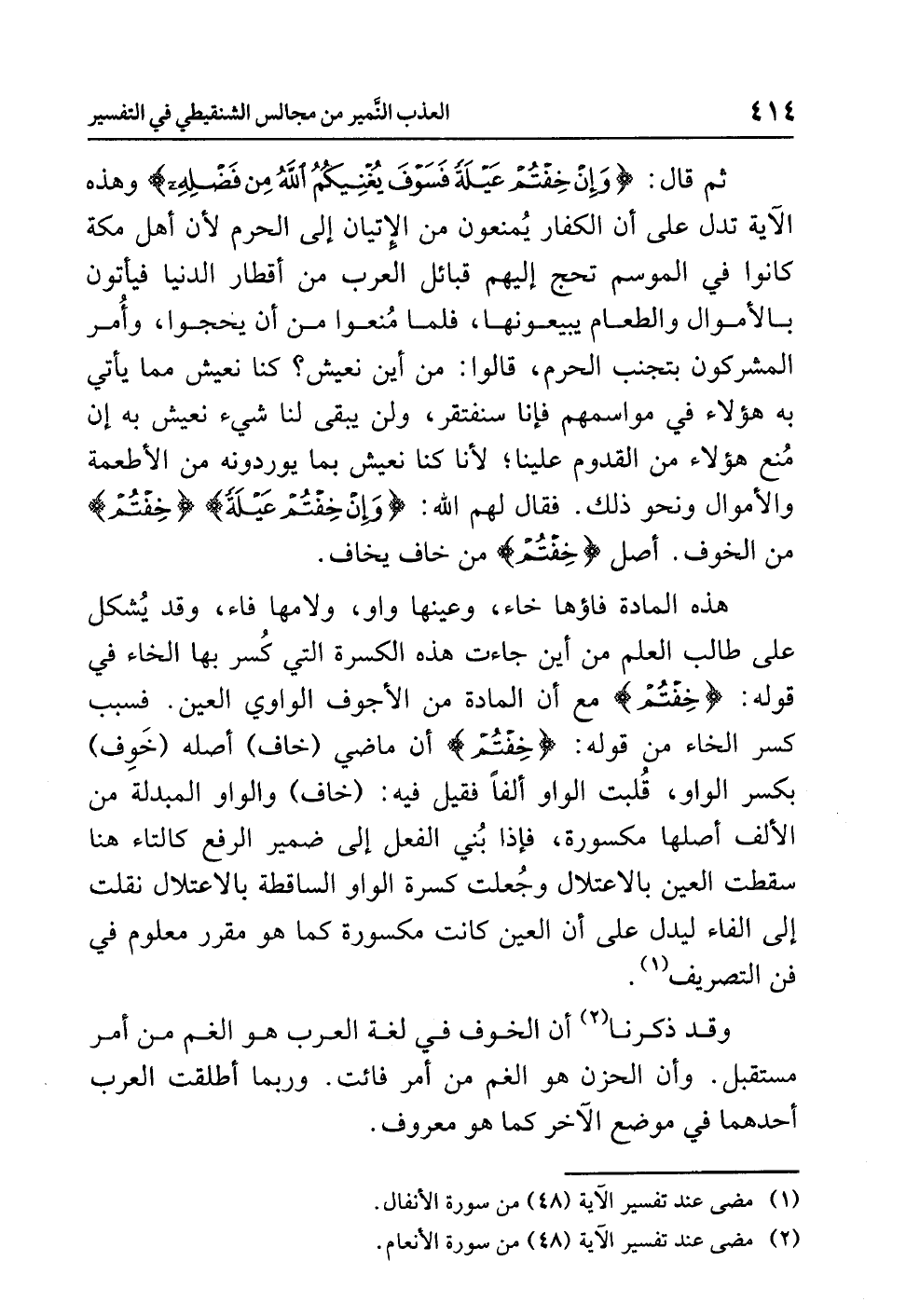ثم قال: {وَإِنْ خِفْتُمْ عَيْلَةً فَسَوْفَ يُغْنِيكُمُ اللَّهُ مِنْ فَضْلِهِ} وهذه الآيةُ تَدُلُّ على أن الكفارَ يُمْنَعُونَ من الإتيانِ إلى الحرمِ لأن أهلَ مكةَ كانوا في الموسمِ تَحُجُّ إليهم قبائلُ العربِ من أقطارِ الدنيا فيأتونَ بالأموالِ والطعامِ يبيعونَها، فَلَمَّا مُنِعُوا من أن يَحُجُّوا، وَأُمِرَ المشركونَ بتجنبِ الحرمِ، قالوا: مِنْ أينَ نعيشُ؟ كنا نعيشُ مما يأتِي به هؤلاء في مواسمِهم فإنا سَنَفْتَقِرُ، ولن يبقَى لنا شيءٌ نعيشُ به إن مُنِعَ هؤلاء من القدومِ علينا؛ لأنا كنا نعيش بما يُورِدُونَهُ من الأطعمةِ والأموالِ ونحوِ ذلك. فقال لهم اللَّهُ: {وَإِنْ خِفْتُمْ عَيْلَةً} {خِفْتُمْ} من الخوفِ. أصلُ {خِفْتُمْ} مِنْ خَافَ يَخَافُ.