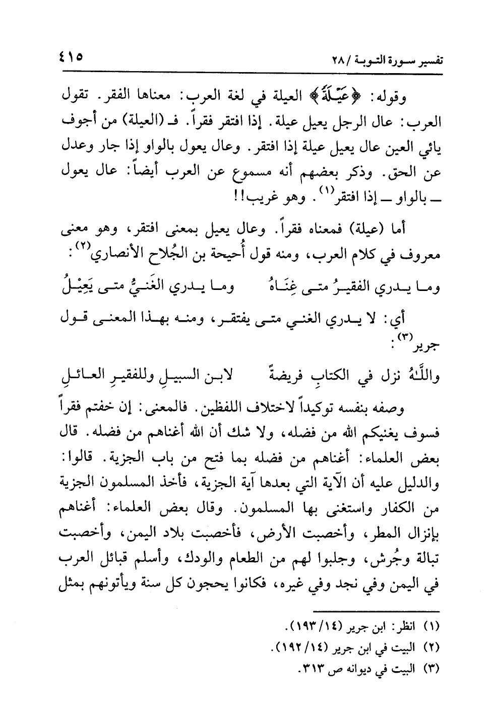 وَصَفَهُ بنفسِه توكيدًا لاختلافِ اللفظينِ. فالمعنَى: إِنْ خِفْتُمْ فَقْرًا فسوف يُغْنِيكُمُ اللَّهُ من فضلِه، ولا شكَّ أن اللَّهَ أَغْنَاهُمْ من فضلِه. قال بعضُ العلماءِ: أَغْنَاهُمْ من فضلِه بما فَتَحَ من بابِ الجزيةِ. قالوا: والدليلُ عليه أن الآيةَ التي بعدَها آيةُ الجزيةِ، فَأَخَذَ المسلمونَ الجزيةَ من الكفارِ واستغنَى بها المسلمونَ. وقال بعضُ العلماءِ: أَغْنَاهُمْ بإنزالِ المطرِ، وَأَخْصَبَتِ الأرضُ، فَأَخْصَبَتْ بلادُ اليمنِ، وأخصبت تبالةُ وجُرش، وجلبوا لهم من الطعامِ والودكِ، وأسلمَ قبائلُ العربِ في اليمنِ وفي نَجْدٍ وفِي غيرِه، فكانوا يَحُجُّونَ كُلَّ سنةٍ ويأتونَهم بمثلِ