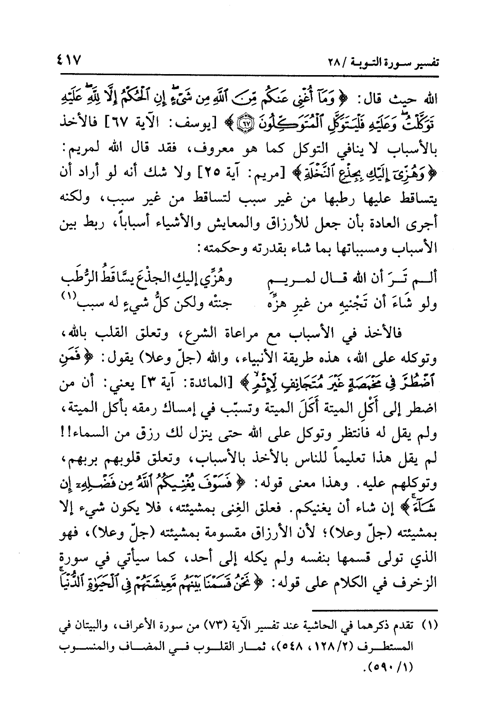اللَّهِ حيث قَالَ: {وَمَا أُغْنِي عَنْكُم مِّنَ اللَّهِ مِنْ شَيْءٍ إِنِ الْحُكْمُ إِلاَّ لِلَّهِ عَلَيْهِ تَوَكَّلْتُ وَعَلَيْهِ فَلْيَتَوَكَّلِ الْمُتَوَكِّلُونَ} [يوسف: الآية 67] فالأخذُ بالأسبابِ لاَ ينافِي التوكلَ كما هو معروفٌ، وقد قال اللَّهُ لمريمَ: {وَهُزِّي إِلَيْكِ بِجِذْعِ النَّخْلَةِ} [مريم: آية 25] ولا شَكَّ أنه لو أَرَادَ أن يتساقطَ عليها رُطَبُهَا من غيرِ سببٍ لَتَسَاقَطَ مِنْ غيرِ سببٍ، ولكنه أَجْرَى العادةَ بِأَنْ جَعَلَ للأرزاقِ والمعايشِ والأشياءِ أسبابًا، رَبَطَ بَيْنَ الأسبابِ ومسبباتِها بما شَاءَ بقدرتِه وحكمتِه: