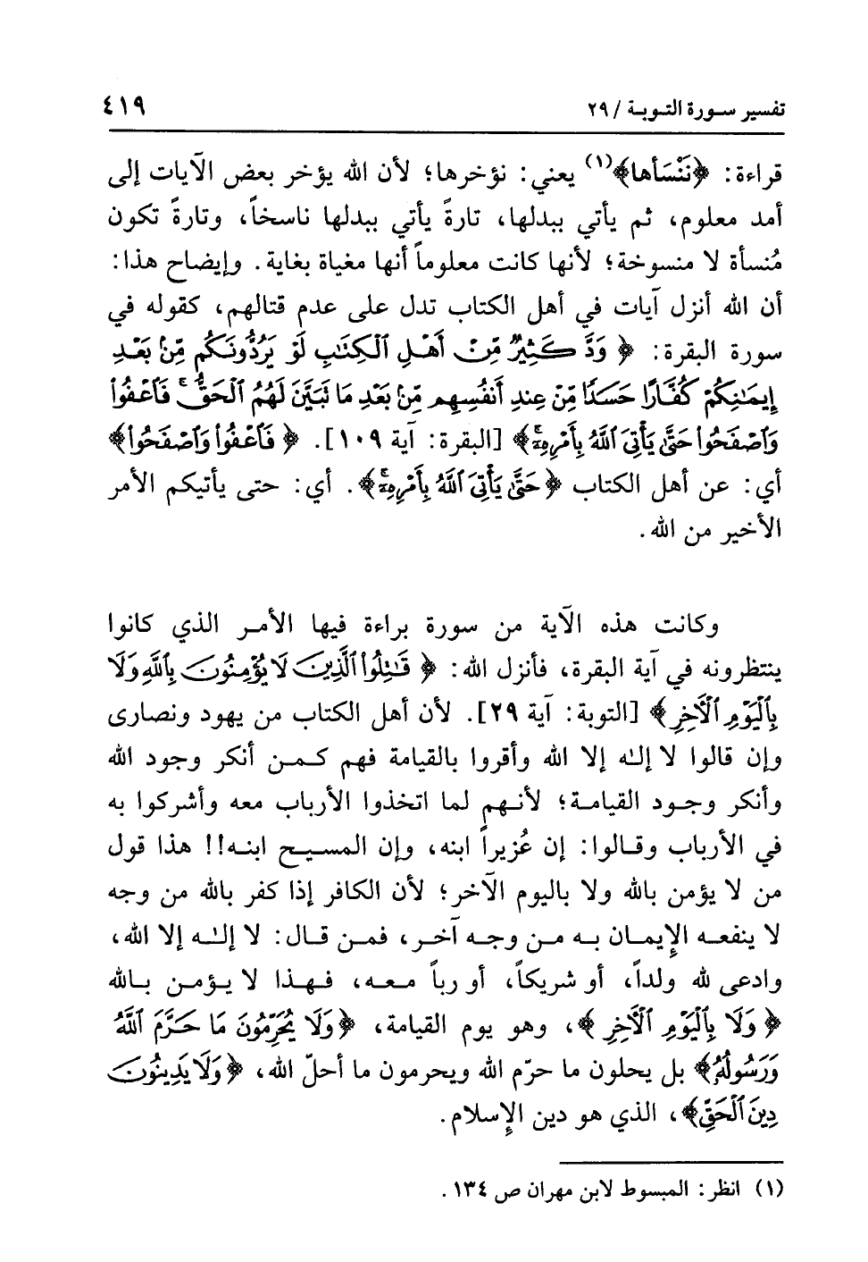 قراءةِ {نَنْسَأها} (¬1) يعني: نُؤَخِّرُهَا؛ لأن اللَّهَ يؤخرُ بعضَ الآياتِ إلى أمدٍ معلومٍ، ثم يأتِي ببدلها، تارةً يأتِي ببدلِها ناسخًا، وتارةً تكونُ مُنسأة لا منسوخةً؛ لأنها كانت مَعْلُومًا أنها مُغَيَّاةٌ بغايةٍ. وإيضاحُ هذا: أن اللَّهَ أَنْزَلَ آياتٍ في أهلِ الكتابِ تَدُلُّ على عدمِ قتالِهم، كقولِه في سورةِ البقرةِ: {وَدَّ كَثِيرٌ مِّنْ أَهْلِ الْكِتَابِ لَوْ يَرُدُّونَكُم مِّنْ بَعْدِ إِيمَانِكُمْ كُفَّارًا حَسَدًا مِّنْ عِنْدِ أَنفُسِهِم مِّنْ بَعْدِ مَا تَبَيَّنَ لَهُمُ الْحَقُّ فَاعْفُوا وَاصْفَحُوا حَتَّى يَأْتِيَ اللَّهُ بِأَمْرِهِ} [البقرة: آية 109]. {فَاعْفُوا وَاصْفَحُوا} أي: عن أهلِ الكتابِ {حَتَّى يَأْتِيَ اللَّهُ بِأَمْرِهِ} أي: حتى يأتيَكم الأمرُ الأخيرُ من الله. وكانت هذه الآيةُ من سورةِ براءة فيها الأمرُ الذي كانوا ينتظرونَه في آيةِ البقرةِ، فَأَنْزَلَ اللَّهُ: {قَاتِلُوا الَّذِينَ لاَ يُؤْمِنُونَ بِاللَّهِ وَلاَ بِالْيَوْمِ الآخِرِ} [التوبة: آية 29].