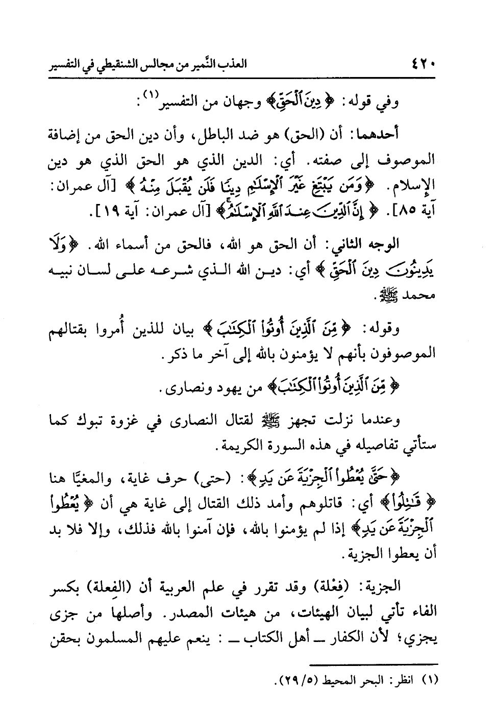 الوجهُ الثانِي: أن الحقَّ هو اللَّهُ، فالحقُّ من أسماءِ اللَّهِ. {وَلا يَدِينُونَ دِينَ الْحَقِّ} أي: دين الله الذي شَرَعَهُ على لسانِ نَبِيِّهِ محمدٍ صلى الله عليه وسلم.