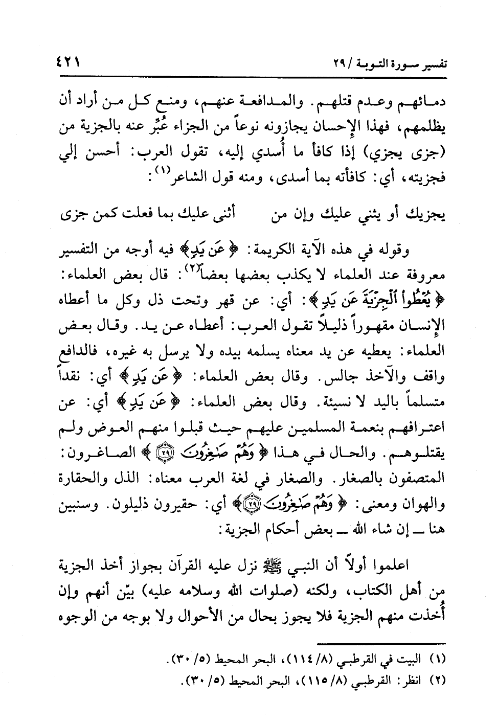 وقولُه في هذه الآيةِ الكريمةِ: {عَنْ يَدٍ} فيه أَوْجُهٌ من التفسيرِ معروفةٌ عندَ العلماءِ لاَ يُكَذِّبُ بعضُها بعضًا (¬2): قال بعضُ العلماءِ: {يُعْطُوا الْجِزْيَةَ عَنْ يَدٍ}: أي: عَنْ قهر وتحتَ ذُلٍّ وكلِّ ما أعطاه الإنسانُ مقهورًا ذليلاً تقولُ العربُ: أَعْطَاهُ عَنْ يَدٍ. وقال بعضُ العلماءِ: يُعْطِيهِ عن يدٍ معناه: يُسَلِّمُهُ بيدِه ولاَ يُرْسِلُ به غيرَه، فالدافعُ واقفٌ والآخِذُ جالسٌ. وقال بعضُ العلماءِ: {عَنْ يَدٍ} أَيْ: نَقْدًا مُتسلمًا باليدِ لا نسيئةً. وقال بعضُ العلماءِ: {عَنْ يَدٍ} أي: عن اعترافِهم بنعمةِ المسلمينَ عليهم حيث قَبِلُوا منهم العوضَ ولم يقتلوهم. والحالُ في هذا {وَهُمْ صَاغِرُونَ} الصاغرونَ: المتصفونَ بالصَّغَارِ. والصَّغَارُ في لغةِ العربِ معناه: الذلُّ والحقارةُ والهوانُ. ومعنَى: {وَهُمْ صَاغِرُونَ} أي: حَقِيرُونَ ذَلِيلُونَ. وَسَنُبَيِّنُ هنا - إن شاء الله - بعضَ أحكامِ الجزيةِ: