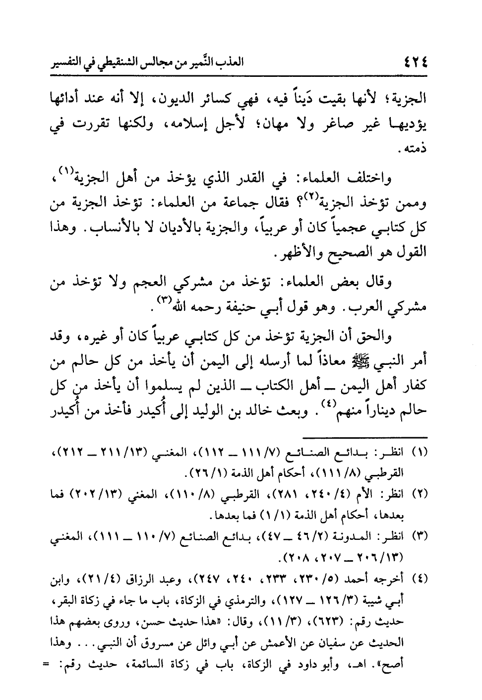 والحقُّ أن الجزيةَ تُؤْخَذُ من كُلِّ كتابيٍّ عربيًّا كان أو غيرَه، وقد أَمَرَ النبيُّ صلى الله عليه وسلم مُعَاذًا لَمَّا أرسلَه إلى اليمنِ أن يأخذَ من كُلِّ حالمٍ من كفارِ أهلِ اليمنِ - أهلِ الكتابِ - الذين لم يُسْلِمُوا أن يأخذَ من كُلِّ حالمٍ دينارًا منهم (¬4).
