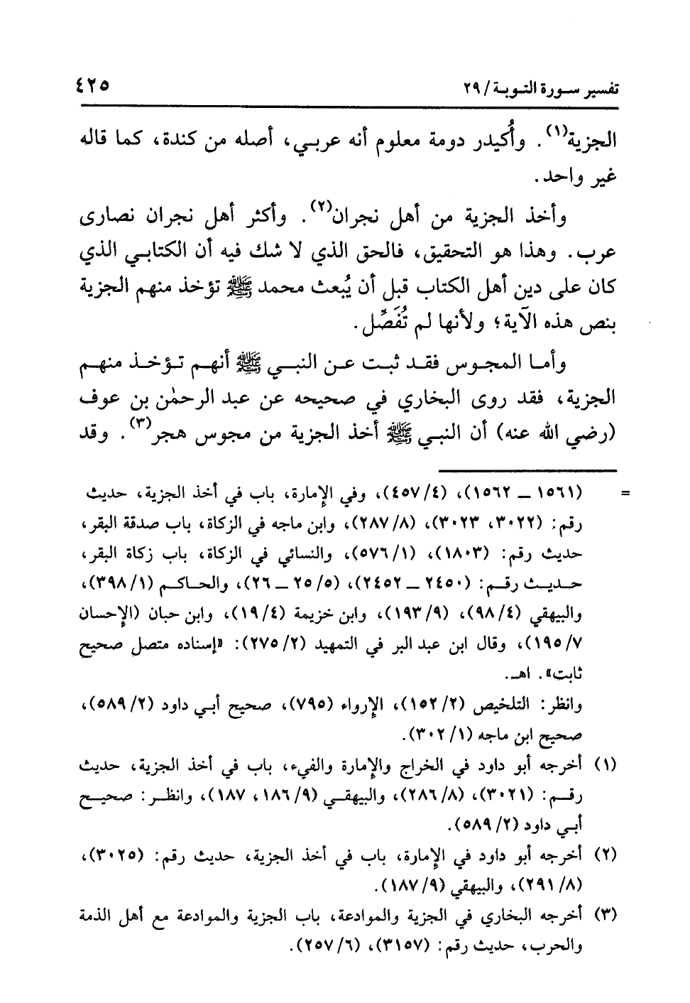 وَأَخَذَ الجزيةَ من أهلِ نجرانَ (¬2). وأكثرُ أهلِ نجرانَ نصارى عربٌ. وهذا هو التحقيقُ، فالحقُّ الذي لا شكَّ فيه أن الكتابيَّ الذي كان على دينِ أهلِ الكتابِ قبلَ أن يُبْعَثَ محمدٌ صلى الله عليه وسلم تُؤْخَذُ منهم الجزيةُ بنصِّ هذه الآيةِ؛ ولأَنَّهَا لم تُفَصِّلْ.