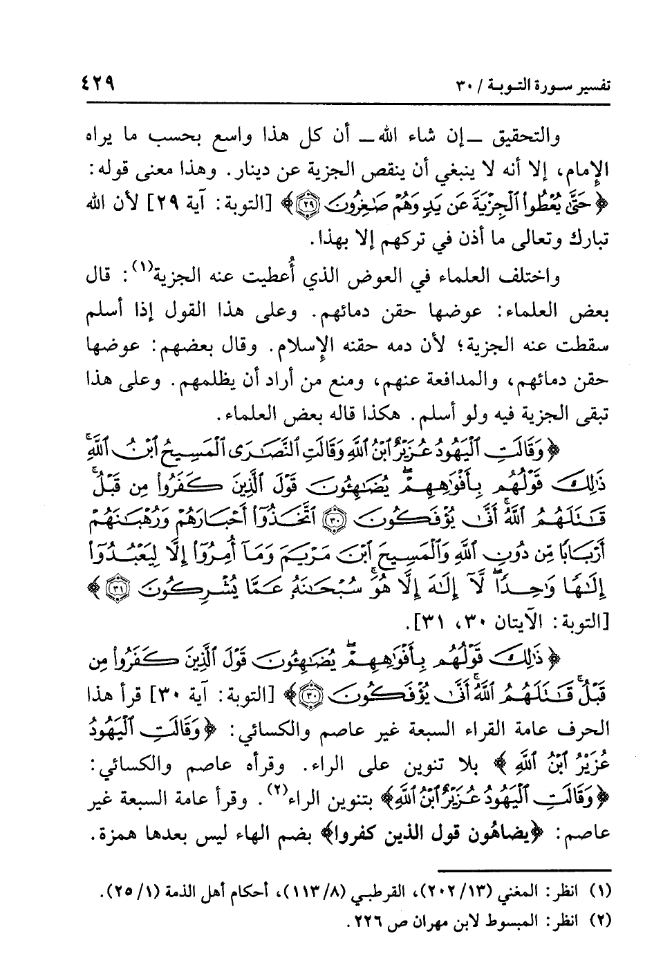 (¬1) انظر: المغني (13/ 202)، القرطبي (8/ 113)، أحكام أهل الذمة (1/ 25).