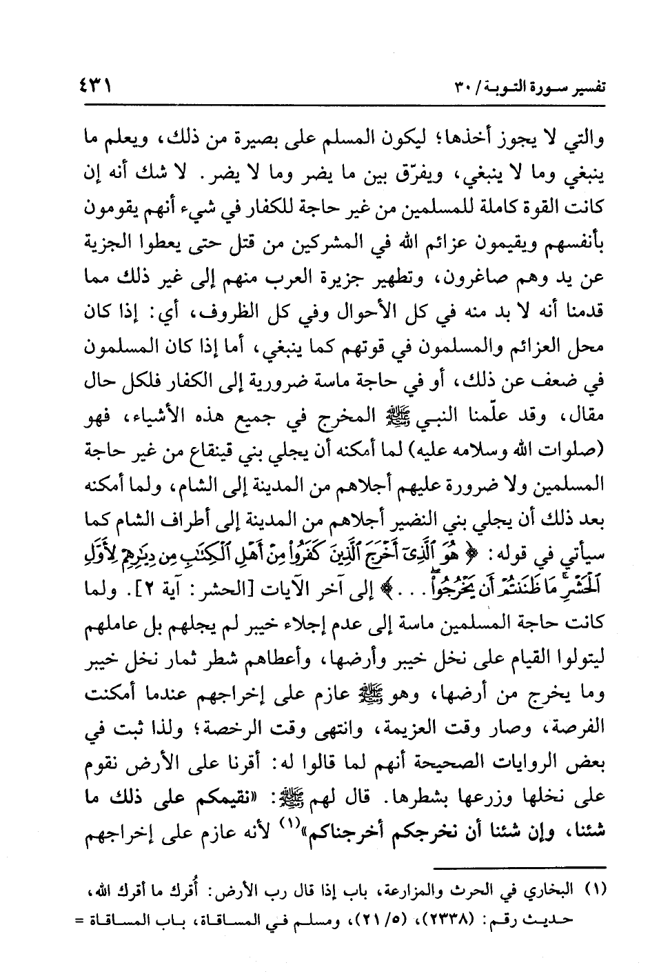 والتي لا يجوزُ أخذُها؛ ليكونَ المسلمُ على بصيرةٍ من ذلك، ويعلمَ ما ينبغي وما لا ينبغي، وَيُفَرِّقَ بينَ ما يضرُّ وما لا يضرُّ. لاَ شَكَّ أنه إن كانت القوةُ كاملةً للمسلمينَ من غيرِ حاجةٍ للكفارِ في شيءٍ أنهم يقومونَ بأنفسِهم ويقيمونَ عزائمَ اللَّهِ في المشركينَ مِنْ قَتْلٍ حتى يُعْطُوا الجزيةَ عن يدٍ وهم صاغرونَ، وتطهيرُ جزيرةِ العربِ منهم إلى غيرِ ذلك مِمَّا قَدَّمْنَا أنه لا بُدَّ منه في كُلِّ الأحوالِ وفي كُلِّ الظروفِ، أي: إذا كان محل العزائمِ والمسلمون في قوتِهم كما ينبغي، أما إذا كان المسلمونَ في ضَعْفٍ عن ذلك، أو في حاجةٍ ماسةٍ ضروريةٍ إلى الكفارِ فَلِكُلِّ حالٍ مقالٌ، وقد عَلَّمَنَا النبيُّ صلى الله عليه وسلم الْمَخْرَجَ في جميعِ هذه الأشياءِ، فهو (صلواتُ اللَّهِ وسلامُه عليه) لَمَا أَمْكَنَهُ أن يُجْلِيَ بني قَيْنُقَاعَ من غيرِ حاجةِ المسلمينَ ولا ضرورةٍ عليهم أجلاهم من المدينةِ إلى الشامِ، وَلَمَا أمكنَه بعد ذلك أن يُجْلِيَ بنِي النضيرِ أجلاهم من المدينةِ إلى أطرافِ الشامِ كما سيأتِي في قولِه: {هُوَ الَّذِي أَخْرَجَ الَّذِينَ كَفَرُوا مِنْ أَهْلِ الْكِتَابِ مِنْ دِيَارِهِمْ لِأَوَّلِ الْحَشْرِ مَا ظَنَنْتُمْ أَنْ يَخْرُجُوا ... } إلى آخِرِ الآياتِ [الحشر: آية 2]. وَلَمَّا كانت حاجةُ المسلمينَ ماسةً إلى عدمِ إجلاءِ خيبر لم يُجْلِهِمْ بل عَامَلَهُمْ ليتولوا القيامَ على نَخْلِ خيبرَ وأرضِها، وأعطاهم شَطْرَ ثمارِ نخلِ خيبرَ وما يخرجُ من أرضِها، وهو صلى الله عليه وسلم عازمٌ على إخراجِهم عندما أَمْكَنَتِ الفرصةُ، وصار وقتُ العزيمةِ، وانتهى وقتُ الرخصةِ؛ وَلِذَا ثَبَتَ في بعضِ الرواياتِ الصحيحةِ أنهم لَمَّا قالوا له: أَقِرَّنَا على الأرضِ نقومُ على نَخْلِهَا وزرعِها بشطرِها. قال لهم صلى الله عليه وسلم: «نُقِيمُكُمْ عَلَى ذَلِكَ مَا شَئْنَا، وَإِنْ شِئْنَا أَنْ نُخْرِجَكُمْ أَخْرَجْنَاكُمْ» (¬1)