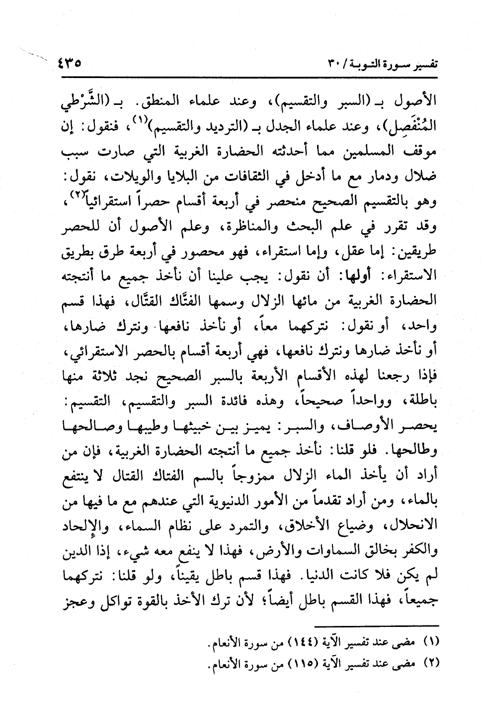 الأصولِ بـ (السَّبْرِ وَالتَّقْسِيمِ)، وعندَ علماءِ المنطقِ. بـ (الشَّرْطِيِّ الْمُنْفَصِلِ)، وعندَ علماءِ الجدلِ بـ (الترديدِ والتقسيمِ) (¬1)، فنقولُ: إن موقفَ المسلمينَ مِمَّا أَحْدَثَتْهُ الحضارةُ الغربيةُ التي صارت سببَ ضلالٍ ودمارٍ مع ما أُدْخِلَ في الثقافاتِ من البلايا والويلاتِ، نقولُ: وهو بالتقسيمِ الصحيحِ منحصرٌ في أربعةِ أقسامٍ حَصْرًا اسْتِقْرَائِيًّا (¬2)، وقد تَقَرَّرَ في علمِ البحثِ والمناظرةِ، وعلمِ الأصولِ أن للحصرِ طَرِيقَيْنِ: إما عَقْلٌ، وإما استقراءٌ، فهو محصورٌ في أربعةِ طرقٍ بطريقِ الاستقراءِ: