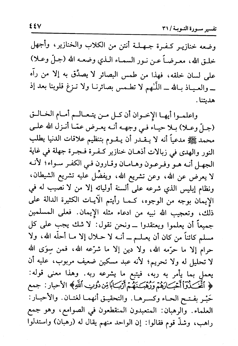 وَاعْلَمُوا - أيها الإخوانُ - أن كُلَّ مَنْ يَتَعَالَمُ أمامَ الخالقِ (جلَّ وعلا) بلا حياءٍ في وَجْهِهِ أنه يُعْرِضُ عمَّا أَنْزَلَ اللَّهُ على محمدٍ صلى الله عليه وسلم مُدَّعِيًا أنه لا يَقْدِرُ أن يقومَ بتنظيمِ علاقاتِ الدنيا يطلبُ النورَ وَالْهُدَى في زبالاتِ أذهانِ خنازيرَ كفرةٍ فجرةٍ جهلةٍ في غايةِ الجهلِ أنه هو وفرعونُ وهامانُ وقارونُ في الكفرِ سواءٌ، لأنه لا يُعْرِضُ عن اللَّهِ، وعن تشريعِ اللَّهِ، ويفضِّل عليه تشريعَ الشيطانِ، ونظامَ إبليسَ الذي شَرَعَهُ على ألسنةِ أوليائِه إلا مَنْ لاَ نصيبَ له في الإيمانِ بوجهٍ مِنَ الوجوهِ، كما رأيتُم الآياتِ الكثيرةَ الدالةَ على ذلك، وَتَعْجِيبُ اللَّهِ نَبِيَّهُ مِنَ ادِّعَاءِ مِثْلِهِ الإيمانَ. فعلى المسلمينَ جميعًا أن يعلموا ويعتقدوا- ونحن نقولُ: لاَ شَكَّ يجبُ على كُلِّ مسلمٍ كَائِنًا مَنْ كان أن يعلمَ- أنه لاَ حلالَ إلا ما أَحَلَّهُ اللَّهُ، ولا حرامَ إلا ما حَرَّمَهُ اللَّهُ، ولا دينَ إلا ما شَرَّعَهُ اللَّهُ، فَمَنْ سِوَى اللَّهِ لاَ تحليلَ له ولا تحريمَ؛ لأنه عَبْدٌ مسكينٌ ضعيفٌ مربوبٌ، عليه أن يعملَ بما يَأْمُرُ بِهِ رَبُّهُ، فيتبعُ ما يُشَرِّعُهُ رَبُّهُ. وهذا معنَى قولِه: {اتَّخَذُوا أَحْبَارَهُمْ وَرُهْبَانَهُمْ أَرْبَابًا مِّنْ دُونِ اللَّهِ} الأحبارُ: جَمْعُ حَبْرٍ بفتحِ الحاءِ وكسرِها. والتحقيقُ أنهما لغتانِ. والأحبارُ: العلماءُ. والرهبانُ: المتعبدونَ المنقطعونَ في الصوامعِ، وهو جمعُ راهبٍ، وشذَّ قومٌ فقالوا: إن الواحدَ منهم يقال له (رهبان) واستدلوا