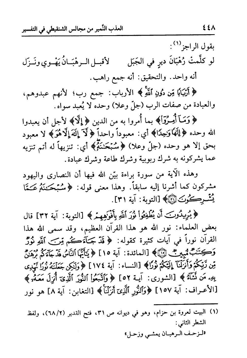 {يُرِيدُونَ أَنْ يُطْفِؤُوا نُورَ اللَّهِ بِأَفْوَاهِهِمْ} [التوبة: آية 32] قال بعضُ العلماءِ: نورُ اللَّهِ هو هذا القرآنُ العظيمُ، وقد سَمَّى اللَّهُ هذا القرآنَ نُورًا في آياتٍ كثيرةٍ كقولِه: {قَدْ جَاءَكُم مِّنَ اللَّهِ نُورٌ وَكِتَابٌ مُّبِينٌ} [المائدة: آية 15] {يَا أَيُّهَا النَّاسُ قَدْ جَاءَكُمْ بُرْهَانٌ مِّن رَّبِّكُمْ وَأَنْزَلْنَا إِلَيْكُمْ نُورًا} [النساء: آية 174] {وَلَكِنْ جَعَلْنَاهُ نُورًا نَّهْدِي بِهِ مَنْ نَّشَاءُ} [الشورى: آية 52] {وَاتَّبَعُوا النُّورَ الَّذِيَ أُنْزِلَ مَعَهُ} [الأعراف: آية 157] {وَالنُّورِ الَّذِي أَنْزَلْنَا} [التغابن: آية 8] هو نورٌ