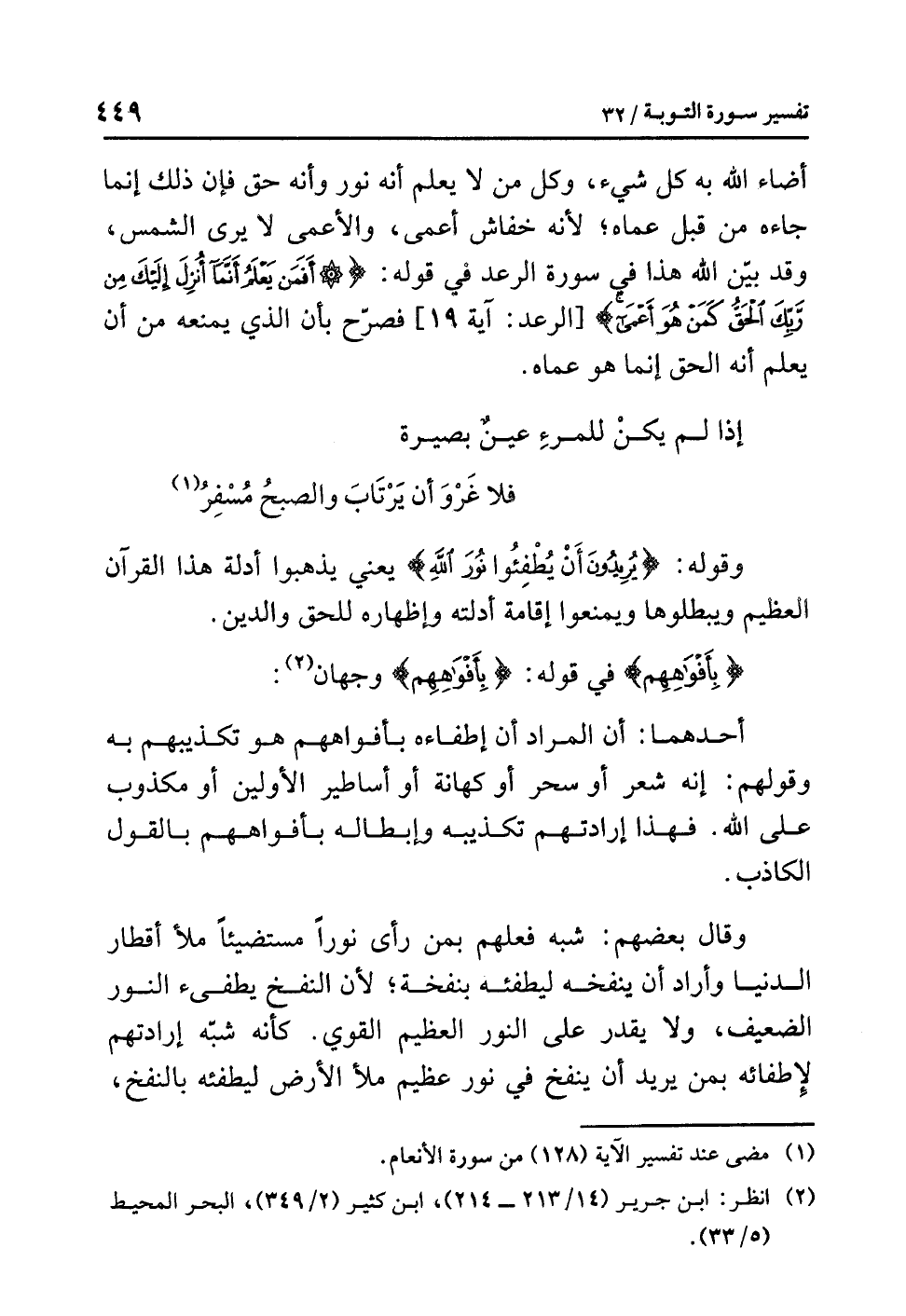 وقال بعضُهم: شَبَّهَ فِعْلَهُمْ بِمَنْ رَأَى نورًا مستضيئًا مَلأَ أَقْطَارَ الدنيا وأرادَ أن ينفخَه ليطفئَه بنفخةٍ؛ لأَنَّ النفخَ يطفئُ النورَ الضعيفَ، ولا يقدرُ على النورِ العظيمِ القويِّ. كأنه شَبَّهَ إرادتَهم لإطفائِه بِمَنْ يريدُ أن ينفخَ في نورٍ عظيمٍ مَلأَ الأرضَ ليطفئَه بالنفخِ،