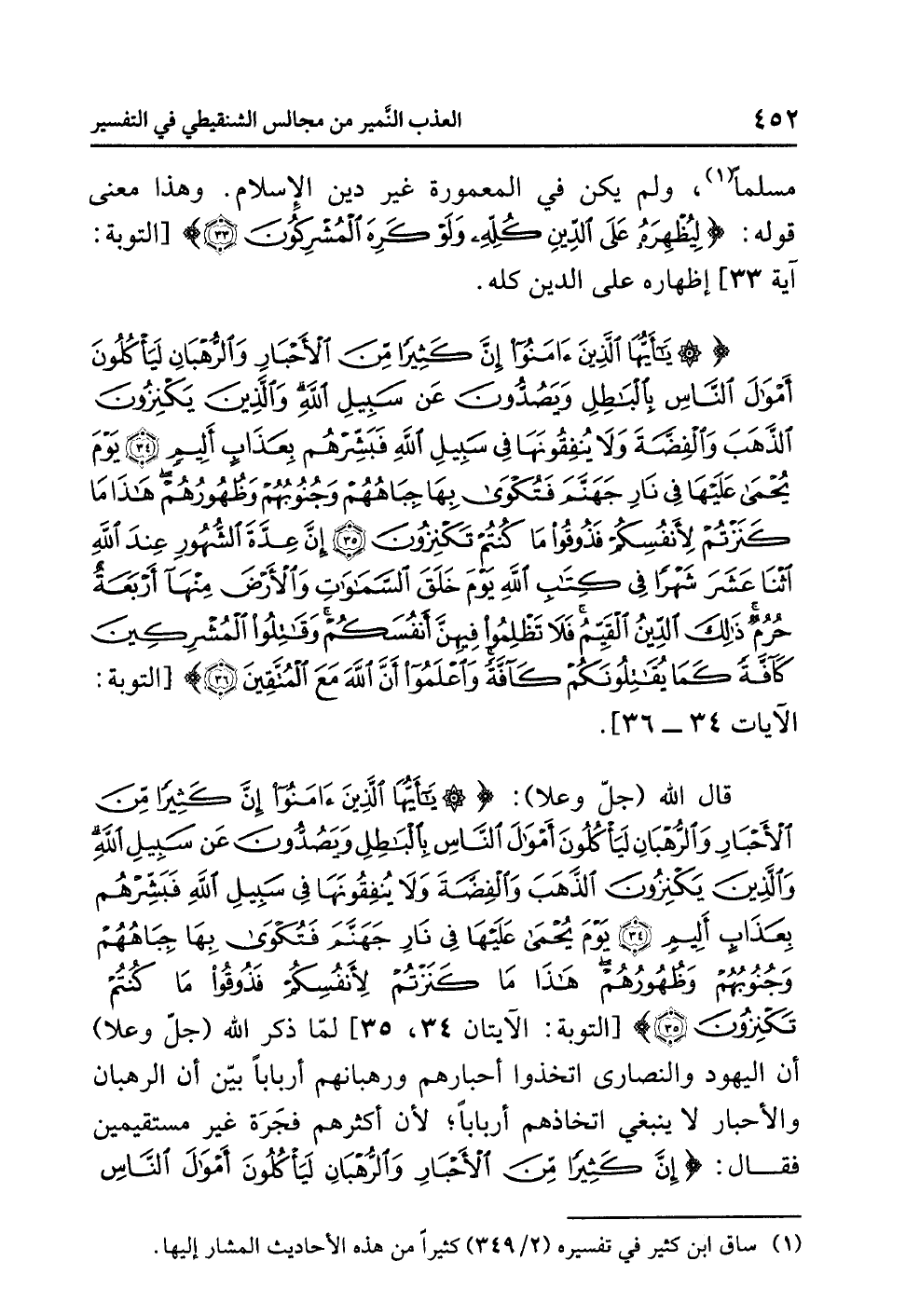 {يَا أَيُّهَا الَّذِينَ آمَنُوا إِنَّ كَثِيرًا مِّنَ الأَحْبَارِ وَالرُّهْبَانِ لَيَأْكُلُونَ أَمْوَالَ النَّاسِ بِالْبَاطِلِ وَيَصُدُّونَ عَنْ سَبِيلِ اللَّهِ وَالَّذِينَ يَكْنِزُونَ الذَّهَبَ وَالْفِضَّةَ وَلاَ يُنْفِقُونَهَا فِي سَبِيلِ اللَّهِ فَبَشِّرْهُمْ بِعَذَابٍ أَلِيمٍ (34) يَوْمَ يُحْمَى عَلَيْهَا فِي نَارِ جَهَنَّمَ فَتُكْوَى بِهَا جِبَاهُهُمْ وَجُنوبُهُمْ وَظُهُورُهُمْ هَذَا مَا كَنَزْتُمْ لأَنْفُسِكُمْ فَذُوقُوا مَا كُنْتُمْ تَكْنِزُونَ (35) إِنَّ عِدَّةَ الشُّهُورِ عِنْدَ اللَّهِ اثْنَا عَشَرَ شَهْرًا فِي كِتَابِ اللَّهِ يَوْمَ خَلَقَ السَّمَاوَاتِ وَالأَرْضَ مِنْهَا أَرْبَعَةٌ حُرُمٌ ذَلِكَ الدِّينُ الْقَيِّمُ فَلاَ تَظْلِمُوا فِيهِنَّ أَنفُسَكُمْ وَقَاتِلُوا الْمُشْرِكِينَ كَافَّةً كَمَا يُقَاتِلُونَكُمْ كَافَّةً وَاعْلَمُوا أَنَّ اللَّهَ مَعَ الْمُتَّقِينَ (36)} [التوبة: الآيات 34 - 36].