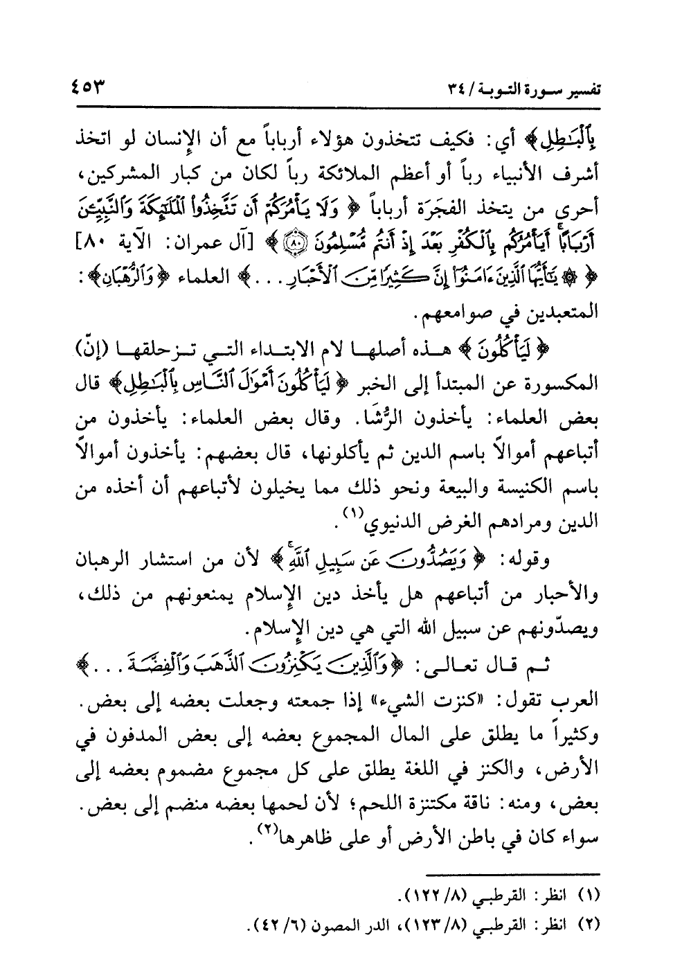{لَيَأْكُلُونَ} هذه أصلُها لامُ الابتداءِ التي تُزَحْلِقُهَا (إِنَّ) المكسورة عن المبتدأِ إلى الخبرِ {لَيَأْكُلُونَ أَمْوَالَ النَّاسِ بِالْبَاطِلِ} قال بعضُ العلماءِ: يأخذونَ الرُّشَا. وقال بعضُ العلماءِ: يأخذونَ من أتباعِهم أموالاً باسمِ الدِّينِ ثم يأكلونَها، قال بعضُهم: يأخذونَ أموالاً باسمِ الكنيسةِ والبيعةِ ونحوِ ذلك مما يُخَيِّلُونَ لأتباعِهم أن أخذَه مِنَ الدِّينِ ومرادُهم الغرضُ الدنيويُّ (¬1).