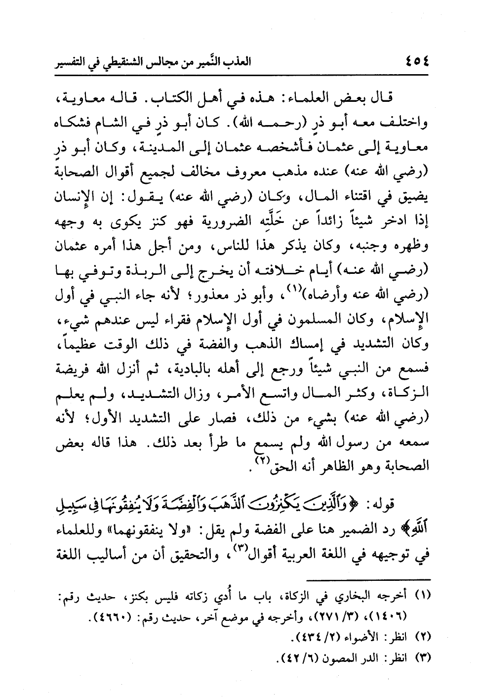 قولُه: {وَالَّذِينَ يَكْنِزُونَ الذَّهَبَ وَالْفِضَّةَ وَلاَ يُنْفِقُونَهَا فِي سَبِيلِ اللَّهِ} رَدَّ الضميرَ هنا على الفضةِ ولم يَقُلْ: «ولاَ ينفقونَهما» وللعلماءِ في توجيهِه في اللغةِ العربيةِ أقوالٌ (¬3)، والتحقيقُ أن من أساليبِ اللغةِ