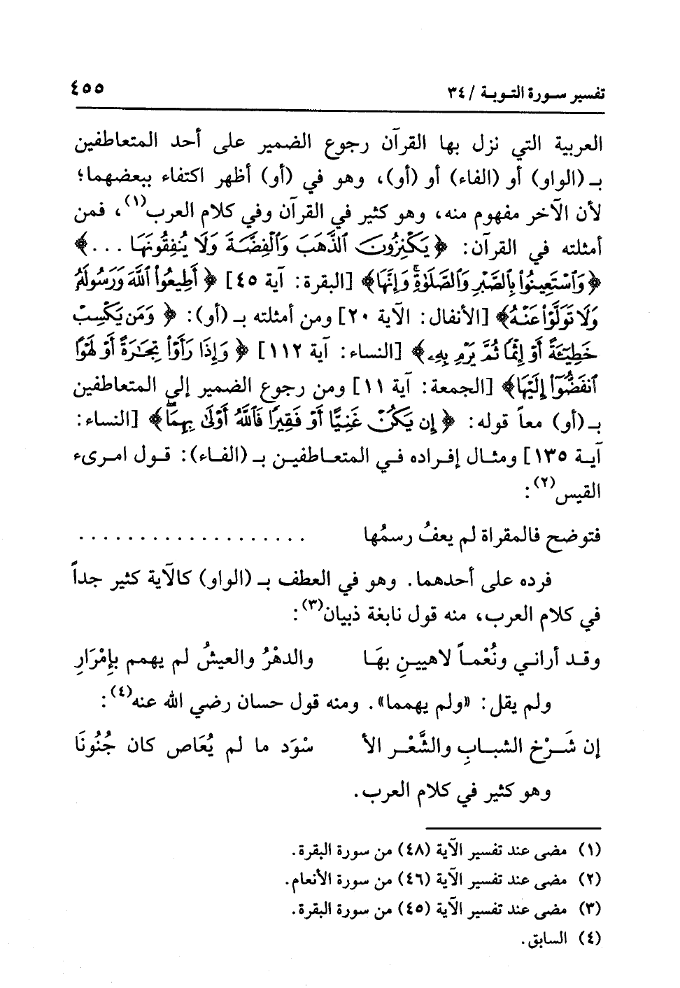 العربيةِ التي نَزَلَ بها القرآنُ رجوعُ الضميرِ على أحدِ الْمُتَعَاطِفَيْنِ بـ (الواو) أو (الفاء) أو (أو)، وهو في (أو) أظهرُ اكتفاءً ببعضِهما؛ لأن الآخَرَ مفهومٌ منه، وهو كثيرٌ في القرآنِ وفي كلامِ العربِ (¬1) فَمِنْ أمثلتِه في القرآنِ: {يَكْنِزُونَ الذَّهَبَ وَالْفِضَّةَ وَلاَ يُنْفِقُونَهَا ... } {وَاسْتَعِينُوا بِالصَّبْرِ وَالصَّلاةِ وَإِنَّهَا} [البقرة: آية 45] {أَطِيعُوا اللَّهَ وَرَسُولَهُ وَلاَ تَوَلَّوْا عَنْهُ} [الأنفال: الآية 20] ومن أمثلتِه بـ (أو): {وَمَنْ يَكْسِبْ خَطِيئَةً أَوْ إِثْمًا ثُمَّ يَرْمِ بِهِ} [النساء: آية 112] {وَإِذَا رَأَوْا تِجَارَةً أَوْ لَهْوًا انفَضُّوا إِلَيْهَا} [الجمعة: آية 11] وَمِنْ رجوعِ الضميرِ إلى المتعاطفينِ بـ (أو) قَوْلُهُ: {إِنْ يَكُنْ غَنِيًّا أَوْ فَقَيرًا فَاللَّهُ أَوْلَى بِهِمَا} [النساء: آية 135] ومثالُ إفرادِه في المتعاطفينِ بـ (الفاء): قولُ امرئِ القيسِ (¬2):