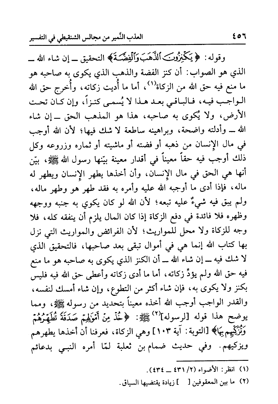 وقولُه: {يَكْنِزُونَ الذَّهَبَ وَالْفِضَّةَ} التحقيقُ - إن شاء الله - الذي هو الصوابُ؛ أن كنزَ الفضةِ والذهبِ الذي يُكْوَى به صاحبُه هو ما مَنَعَ فيه حَقَّ اللَّهِ من الزكاةِ (¬1)، أما ما أُدِّيَتْ زَكَاتُهُ، وَأُخْرِجَ حَقُّ اللَّهِ الواجبُ فيه، فالباقِي بعدَ هذا لا يُسَمَّى كَنْزًا، وإن كان تحتَ الأرضِ، ولا يُكْوَى به صاحبُه، هذا هو المذهبُ الحقُّ - إن شاء الله - وأدلتُه واضحةٌ، وبراهينُه ساطعةٌ لاَ شَكَّ فيها؛ لأن اللَّهَ أَوْجَبَ في مالِ الإنسانِ من ذَهَبِهِ أو فضتِه أو مَاشِيَتِهِ أو ثمارِه وزروعِه، وَكُلُّ ذلك أَوْجَبَ فيه حَقًّا مُعَيَّنًا في أقدارٍ معينةٍ بَيَّنَهَا رسولُ الله صلى الله عليه وسلم، بَيَّنَ أنها هي الحقُّ في مالِ الإنسانِ، وأن أَخْذَهَا يُطَهِّرُ الإنسانَ وَيُطَهِّرُ له مالَه، فإذا أَدَّى ما أوجبَه اللَّهُ عليه وَأَمَرَهُ به فقد طَهُرَ هو وَطَهُرَ مالُه، ولم يَبْقَ فيه شيءٌ عليه تَبَعَةٌ؛ لأن اللَّهَ لو كان يكوي به جنبَه ووجهَه وظهرَه فلا فائدةَ في دفعِ الزكاةِ إذا كان المالُ يَلْزَمُ أن ينفقَه كُلَّهُ، فلا وجهَ للزكاةِ ولا محلَّ للمواريثِ؛ لأن الفرائضَ والمواريثَ التي نَزَلَ بها كتابُ اللَّهِ إنما هي في أموالٍ تبقى بعد صاحبِها، فالتحقيقُ الذي لا شَكَّ فيه - إن شاء الله - أن الكنزَ الذي يُكْوَى به صاحبُه هو ما مَنَعَ فيه حَقَّ اللَّهِ ولم يُؤَدِّ زكاتَه، أما ما أَدَّى زكاتَه وأعطى حَقَّ اللَّهِ فيه فليس بكنزٍ ولا يُكْوَى به، فإن شَاءَ أكثرَ من التطوعِ، وإن شاء أَمْسَكَ لنفسِه، والقدرُ الواجبُ أَوْجَبَ اللَّهُ أَخْذَهُ مُعَيَّنًا بتحديدٍ من رسولِه صلى الله عليه وسلم، وَمِمَّا يوضحُ هذا قولُه [لرسولِه] (¬2) صلى الله عليه وسلم: {خُذْ مِنْ أَمْوَالِهِمْ صَدَقَةً تُطَهِّرُهُمْ وَتُزَكِّيهِم بِهَا} [التوبة: آية 103] وهي الزكاةُ، فَعَرَفْنَا أَنَّ أَخْذَهَا يُطَهِّرُهُمْ ويزكيهم.