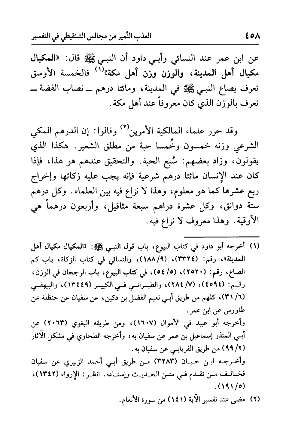 وقد حَرَّرَ علماءُ المالكيةِ الأَمْرَيْنِ (¬2) وقالوا: إن الدرهمَ المكيَّ الشرعيَّ وزنُه خمسونَ وخُمسا حبةٍ من مطلقِ الشعيرِ. هكذا الذي يقولونَ، وزاد بعضُهم: سُبْعُ الحبةِ. والتحقيقُ عندَهم هو هذا، فإذا كان عندَ الإنسانِ مائتا درهمٍ شرعية فإنه يَجِبُ عليه زكاتُها وإخراجُ ربعِ عُشْرِهَا كما هو معلومٌ، وهذا لا نزاعَ فيه بين العلماءِ. وَكُلُّ درهمٍ ستةُ دوانقَ، وكلُّ عشرةِ دراهمَ سبعةُ مثاقيلَ، وأربعونَ درهمًا هي الأوقيةُ. وهذا معروفٌ لاَ نِزَاعَ فيه.