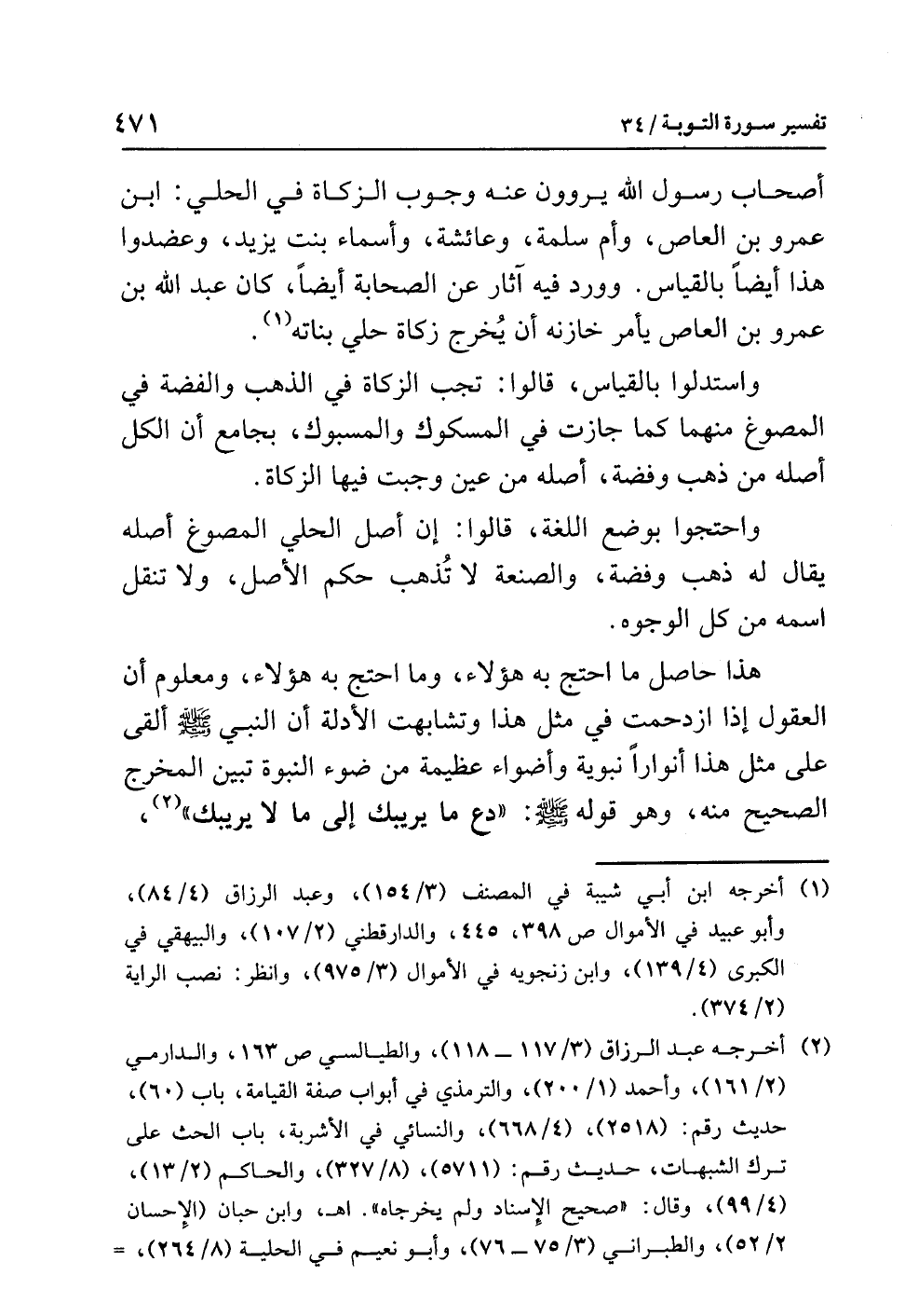 أصحابِ رسولِ اللَّهِ يَرْوُونَ عنه وجوبَ الزكاةِ في الحليِّ: ابنُ عمرِو بنِ العاصِ، وَأُمُّ سلمةَ، وعائشةُ، وأسماءُ بنتُ يزيدَ، وَعَضَّدُوا هذا أيضًا بالقياسِ. وَوَرَدَ فيه آثارٌ عن الصحابةِ أيضًا، كان عبدُ اللَّهِ بنُ عمرِو بنِ العاصِ يأمرُ خازنَه أن يُخْرِجَ زكاةَ حُلِيِّ بناتِه (¬1).