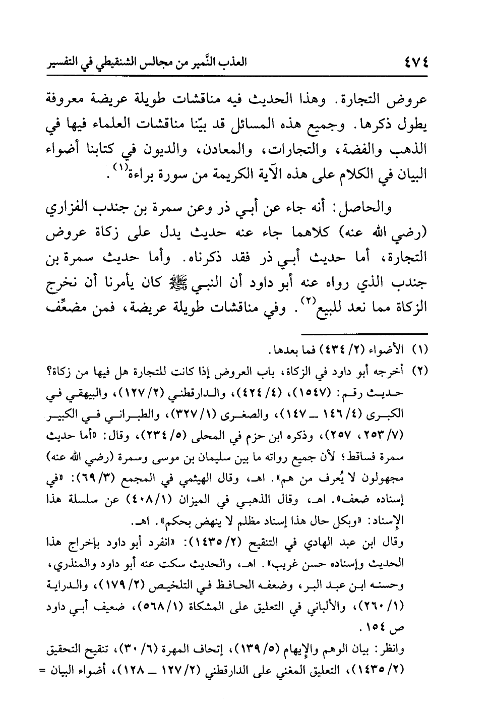 عروضِ التجارةِ. وهذا الحديثُ فيه مناقشاتٌ طويلةٌ عريضةٌ معروفةٌ يطولُ ذِكْرُهَا. وجميعُ هذه المسائلِ قد بَيَّنَّا مناقشاتِ العلماءِ فيها في الذهبِ والفضةِ، والتجاراتِ، والمعادنِ، والديونِ في كتابنا: (أضواء البيان) في الكلامِ على هذه الآيةِ الكريمةِ من سورةِ براءةٍ (¬1).