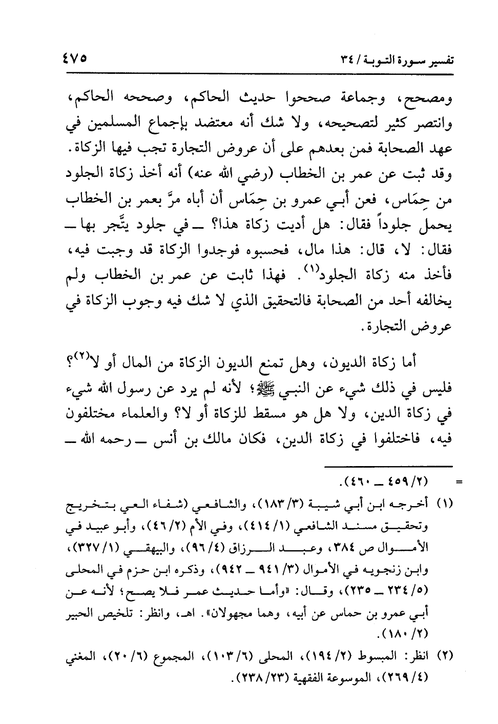 ومصحِّح، وجماعةٌ صَحَّحُوا حديثَ الحاكمِ، وصحَّحه الحاكمُ، وانتصرَ كثيرٌ لتصحيحِه، ولا شَكَّ أنه معتضدٌ بإجماعِ المسلمينَ في عهدِ الصحابةِ فَمَنْ بعدَهم على أن عروضَ التجارةِ تجبُ فيها الزكاةُ. وقد ثَبَتَ عن عمرَ بنِ الخطابِ (رضي الله عنه) أنه أَخَذَ زكاةَ الجلودِ من حِمَاس، فعن أبِي عمرِو بنِ حِمَاس أن أباه مَرَّ بعمرَ بنِ الخطابِ يحملُ جلودًا فقال: هل أديتَ زكاةَ هذا؟ - في جلودٍ يَتَّجِرُ بها - فقال: لاَ، قال: هذا مالٌ، فحسبوه فوجدوا الزكاةَ قد وَجَبَتْ فيه، فأخذ منه زكاةَ الجلودِ (¬1). فهذا ثابتٌ عن عمرَ بنِ الخطابِ ولم يُخَالِفْهُ أحدٌ من الصحابةِ، فالتحقيقُ الذي لا شَكَّ فيه وجوبُ الزكاةِ في عروضِ التجارةِ.