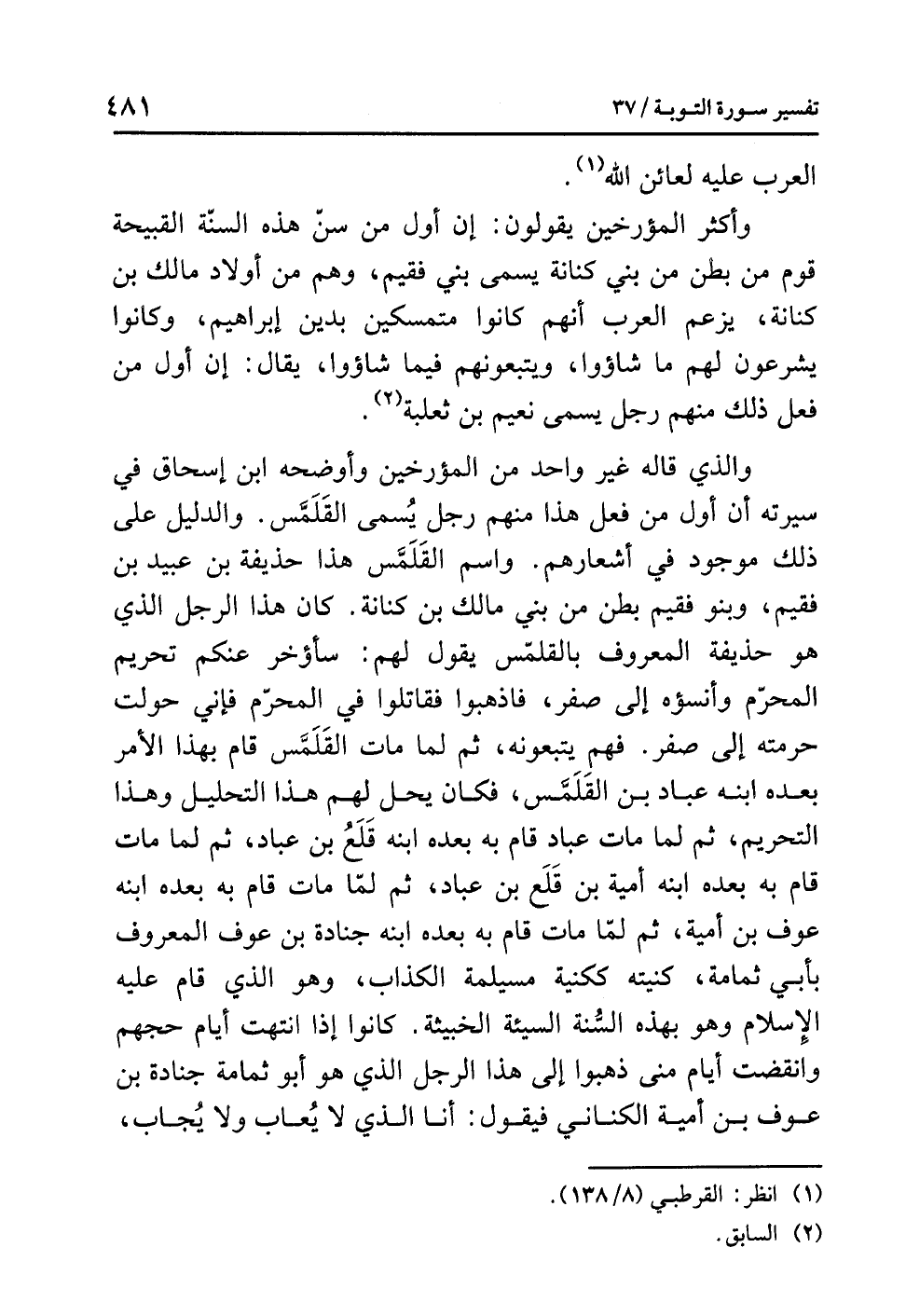 والذي قاله غيرُ واحدٍ من المؤرخينَ وأوضحَه ابنُ إسحاقَ في سيرتِه أن أولَ مَنْ فَعَلَ هذا منهم رجلٌ يُسَمَّى القَلَمَّسَ. والدليلُ على ذلك موجودٌ في أشعارِهم. واسمُ القَلَمَّسِ هذا حذيفةُ بنُ عبيدِ بنِ فقيمٍ، وبنو فقيمٍ بطنٌ من بني مالكِ بنِ كنانةَ. كان هذا الرجلُ الذي هو حذيفةُ المعروفُ بالقلمَّسِ يقولُ لهم: سأؤخرُ عنكم تحريمَ المحرَّم وأنسؤه إلى صَفَرٍ، فاذهبوا فَقَاتِلُوا في المحرَّم فإني حَوَّلْتُ حرمتَه إلى صفر. فَهُمْ يتبعونَه، ثم لَمَّا مَاتَ القَلَمَّسُ قام بهذا الأمرِ بعدَه ابنُه العبادُ بنُ القَلَمَّسِ، فكان يُحِلُّ لهم هذا التحليلَ وهذا التحريمَ، ثم لَمَّا مَاتَ العبادُ قام به بعدَه ابنُه قَلَعُ بنُ عبادٍ، ثم لَمَّا مَاتَ قام به بعدَه ابنُه أميةُ بنُ قَلَعِ بنِ عبادٍ، ثم لَمَّا مات قام به بعدَه ابنُه عوفُ بنُ أميةَ، ثم لَمَّا مات قام به بعدَه ابنُه جنادةُ بنُ عوفٍ المعروفُ بأبي ثمامةَ، كنيتُه ككنيةِ مسيلمةَ الكذابِ، وهو الذي قام عليه الإسلامُ وهو بهذه السُّنةِ السيئةِ الخبيثةِ. كانوا إذا انتهت أيامُ حَجِّهِمُ وَانْقَضَتْ أيامُ مِنَى ذهبوا إلى هذا الرجلِ الذي هو أبو ثمامةَ جنادةُ بنُ عوفِ بنِ أميةَ الكنانيُّ فيقولُ: أنا الذي لاَ يُعَابُ ولا يُجَابُ،