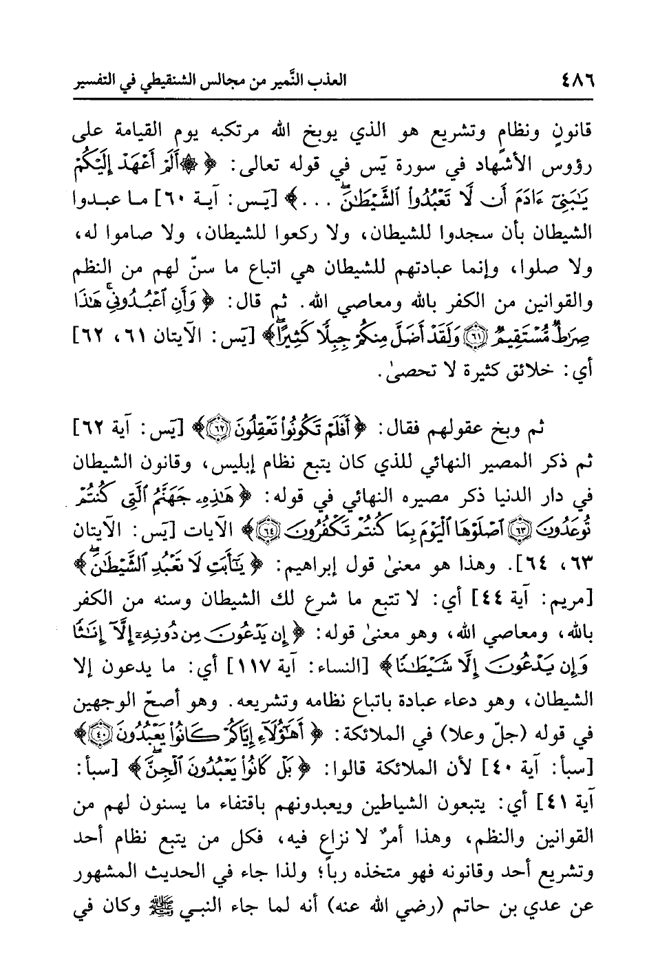 ثم وَبَّخَ عقولَهم فقال: {أَفَلَمْ تَكُونُوا تَعْقِلُونَ} [يس: آية 62] ثم ذَكَرَ المصيرَ النهائيَّ للذي كان يتبعُ نظامَ إبليسَ، وقانونَ الشيطانِ في دارِ الدنيا ذَكَرَ مصيرَه النهائيَّ في قولِه: {هَذِهِ جَهَنَّمُ الَّتِي كُنْتُمْ تُوعَدُونَ (63) اصْلَوْهَا الْيَوْمَ بِمَا كُنْتُمْ تَكْفُرُونَ (64)} الآيات ... [يس: الآيتان 63، 64]. وهذا هو معنَى قولِ إبراهيمَ: {يَا أَبَتِ لاَ تَعْبُدِ الشَّيْطَانَ} [مريم: آية 44] أي: لا تَتَّبِعْ ما شَرَعَ لكَ الشيطانُ وَسَنَّهُ من الكفرِ باللَّه، ومعاصِي اللَّهِ، وهو معنَى قولِه: {إِنْ يَدْعُونَ مِنْ دُونِهِ إِلاَّ إِنَاثًا وَإِنْ يَدْعُونَ إِلاَّ شَيْطَانًا} [النساء: آية 117] أي: ما يدعونَ إلا الشيطانَ، وهو دعاءُ عبادةٍ باتباعِ نظامِه وتشريعِه. وهو أصحُّ الْوَجْهَيْنِ في قولِه (جلَّ وعلا) في الملائكةِ: {أَهَؤُلاَءِ إِيَّاكُمْ كَانُوا يَعْبُدُونَ} [سبأ: آية 40] لأن الملائكةَ قالوا: {بَلْ كَانُوا يَعْبُدُونَ الْجِنَّ} [سبأ: آية 41] أي: يتبعونَ الشياطينَ ويعبدونَهم باقتفاءِ ما يَسُنُّونَ لهم من القوانينَ والنظمِ، وهذا أَمْرٌ لاَ نزاعَ فيه، فَكُلُّ مَنْ يتبعُ نظامَ أحدٍ وتشريعِ أحدٍ وقانونَه فهو متخذُه رَبًّا؛ ولذا جاء في الحديثِ المشهورِ عن عَدِيِّ بنِ حاتمٍ (رضي الله عنه) أنه لَمَّا جاء النبيُّ صلى الله عليه وسلم وكان في