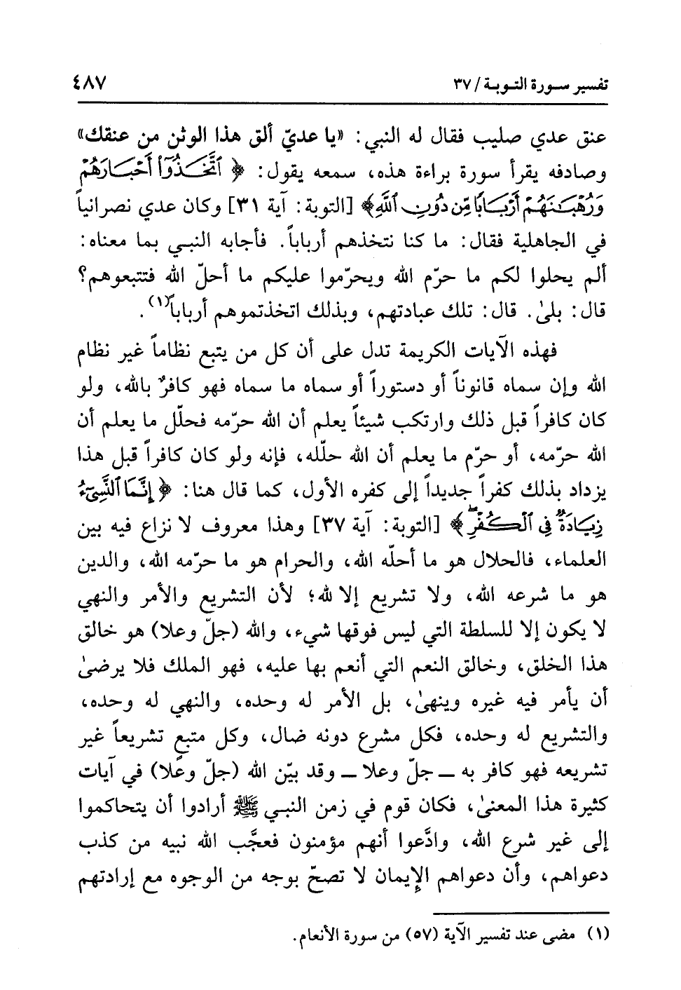 عنقِ عديٍّ صليبٌ فقال له النبيُّ: «يَا عَدِيُّ أَلْقِ هَذَا الْوَثَنَ مِنْ عُنُقِكَ» وصادفَه يقرأُ سورةَ براءة هذه، سَمِعَهُ يقولُ: {اتَّخَذُوا أَحْبَارَهُمْ وَرُهْبَانَهُمْ أَرْبَابًا مِّنْ دُونِ اللَّهِ} [التوبة: آية 31] وكان عَدِيٌّ نَصْرَانِيًّا في الجاهليةِ فقال: ما كنا نتخذُهم أربابًا. فأجابَه النبيُّ بما معناه: أَلَمْ يَحِلُّوا لكم ما حَرَّمَ اللَّهُ ويحرِّموا عليكم ما أحلَّ اللَّهُ فتتبعوهم؟ قال: بلى. قال: تلك عبادتُهم، وبذلك اتخذتُموهم أربابًا (¬1).