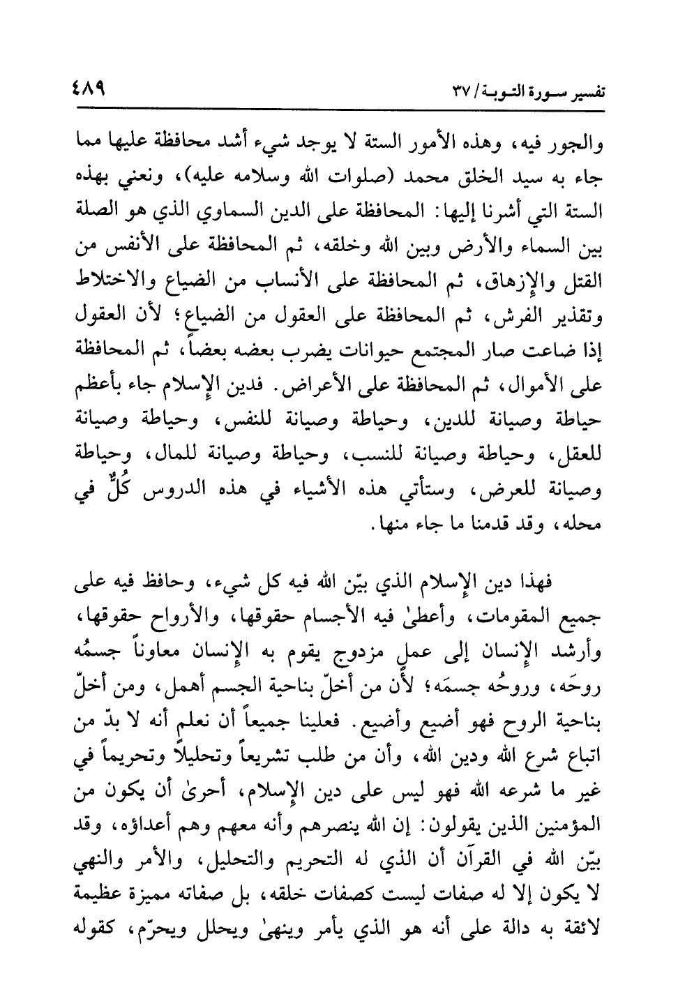 والجورُ فيه، وهذه الأمورُ الستةُ لا يوجدُ شيءٌ أشدُّ محافظةً عليها مما جاء به سيدُ الخلقِ محمدٌ (صلواتُ اللَّهِ وسلامُه عليه)، ونعني بهذه الستةِ التي أَشَرْنَا إليها: المحافظةُ على الدينِ السماويِّ الذي هو الصلةُ بينَ السماءِ والأرضِ وبينَ اللَّهِ وَخَلْقِهِ، ثم المحافظةُ على الأنفسِ من القتلِ والإزهاقِ، ثم المحافظةُ على الأنسابِ من الضياعِ والاختلاطِ وتقذيرِ الفُرُشِ، ثم المحافظةُ على العقولِ من الضياعِ؛ لأن العقولَ إذا ضَاعَتْ صار المجتمعُ حيواناتٍ يضربُ بعضُه بعضًا، ثم المحافظةُ على الأموالِ، ثم المحافظةُ على الأعراضِ. فدينُ الإسلامِ جاء بأعظمِ حياطةٍ وصيانةٍ للدينِ، وحياطة وصيانة للنفسِ، وحياطة وصيانة للعقلِ، وحياطة وصيانة للنَّسَبِ، وحياطة وصيانة للمالِ، وحياطة وصيانة للعِرْضِ، وستأتِي هذه الأشياءُ في هذه الدروسِ كُلٌّ في محلِّه، وقد قَدَّمْنَا ما جاء منها.