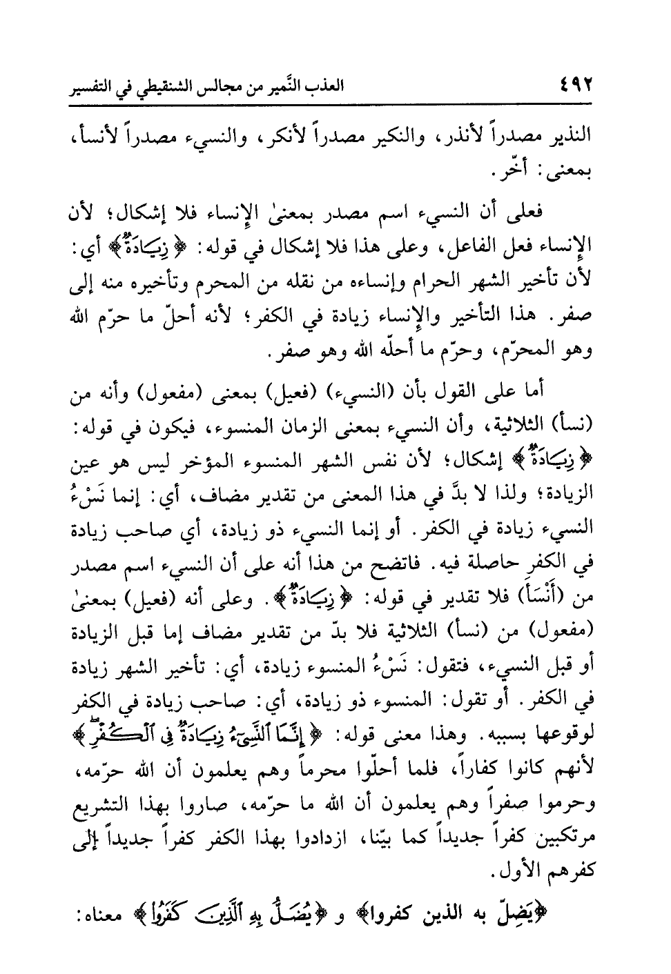 وعلى أنه (فعيلٌ) بمعنَى (مفعولٍ) مِنْ (نَسَأَ) الثلاثيةِ فلا بدَّ من تقديرِ مضافٍ إما قبلَ الزيادةِ أو قبلَ النسيءِ، فتقول: نَسْءُ المنسوءِ زيادةٌ، أي: تأخيرُ الشهرِ زيادةٌ في الكفرِ. أو تقولُ: المنسوءُ ذُو زيادةٍ، أي: صاحبُ زيادةٍ في الكفرِ لوقوعِها بسببِه. وهذا معنَى قولِه: {إِنَّمَا النَّسِيءُ زِيَادَةٌ فِي الْكُفْرِ} لأنهم كانوا كفارًا، فلما أحلُّوا مُحَرَّمًا وهم يعلمونَ أن اللَّهَ حَرَّمَهُ، وحرموا صفرًا وهم يعلمونَ أن اللَّهَ ما حَرَّمَهُ، صاروا بهذا التشريعِ مُرْتَكِبِينَ كُفْرًا جديدًا كما بَيَّنَّا، ازْدَادُوا بهذا الكفرِ كُفْرًا جديدًا إلى كُفْرِهِم الأولِ.
