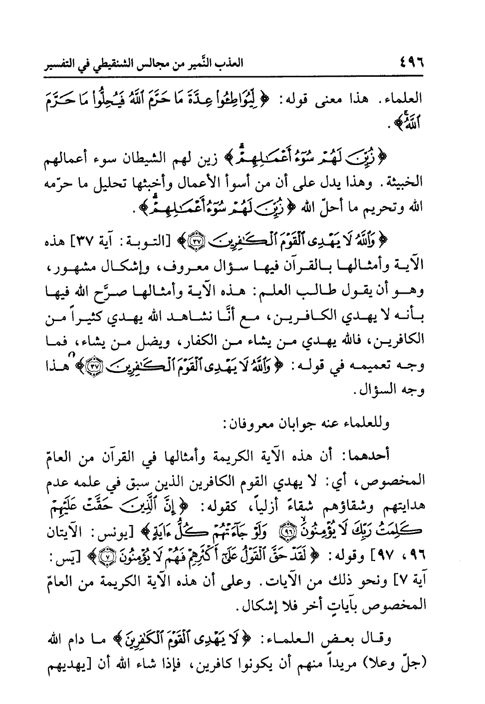 {وَاللَّهُ لاَ يَهْدِي الْقَوْمَ الْكَافِرِينَ} [التوبة: آية 37] هذه الآيةُ وأمثالُها بالقرآنِ فيها سؤالٌ معروفٌ، وَإِشْكَالٌ مشهورٌ، وهو أن يقولَ طالبُ العلمِ: هذه الآيةُ وأمثالُها صرَّح اللَّهُ فيها بأنه لا يهدِي الكافرينَ، مع أنَّا نشاهدُ اللَّهَ يهدي كثيرًا من الكافرينَ، فَاللَّهُ يهدي مَنْ يشاءُ من الكفارِ، ويضلُّ مَنْ يَشَاءُ، فما وَجْهُ تعميمِه في قولِه: {لاَ يَهْدِي الْقَوْمَ الْكَافِرِينَ} هذا وجهُ السؤالِ.