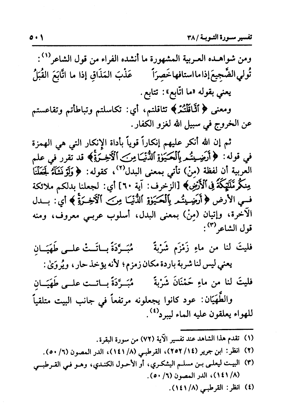 ثم إن اللَّهَ أَنْكَرَ عليهم إنكارًا قويًّا بأداةِ الإنكارِ التي هي الهمزةُ في قولِه: {أَرَضِيتُمْ بِالْحَيَاةِ الدُّنْيَا مِنَ الآخِرَةِ} قد تَقَرَّرَ في عِلْمِ العربيةِ أن لفظةَ (مِنْ) تأتِي بمعنَى البدلِ (¬2)، كقولِه: {وَلَوْ نَشَاءُ لَجَعَلْنَا مِنْكُم مَّلَائِكَةً فِي الْأَرْضِ} [الزخرف: آية 60] أي: لَجَعَلْنَا بَدَلَكُمْ ملائكةً في الأرضِ {أَرَضِيتُمْ بِالْحَيَاةِ الدُّنْيَا مِنَ الآخِرَةِ} أي: بدلَ الآخرةِ، وإتيانُ (مِنْ) بمعنَى البدلِ، أسلوبٌ عربيٌّ معروفٌ، ومنه قولُ الشاعرِ (¬3):