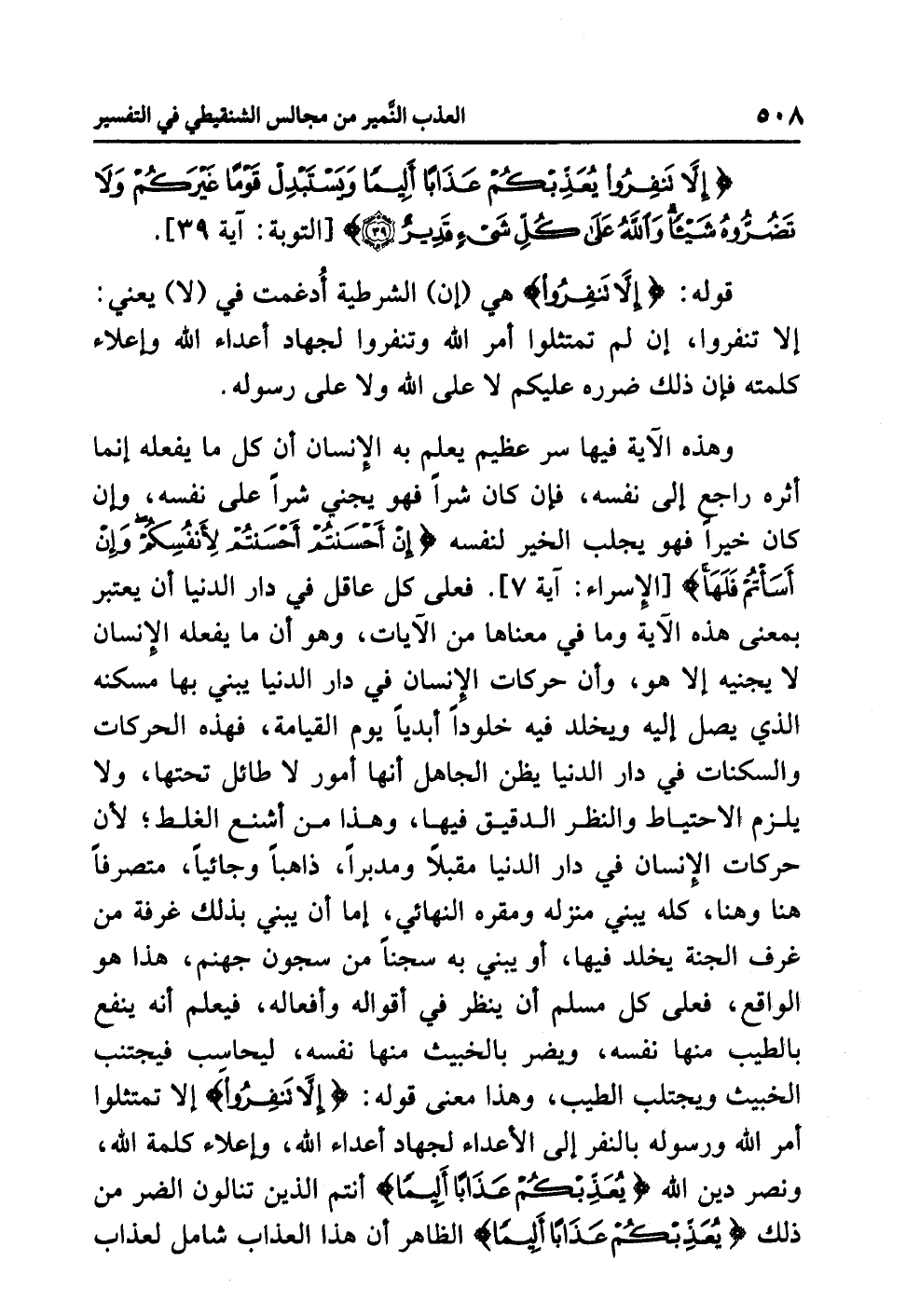 وهذه الآيةُ فيها سِرٌّ عظيمٌ يَعْلَمُ به الإنسانُ أن كُلَّ ما يفعلُه إنما أثرُه راجعٌ إلى نفسِه، فإن كان شَرًّا فهو يَجْنِي شَرًّا على نفسه، وإن كان خيرًا فهو يجلبُ الخيرَ لنفسِه {إِنْ أَحْسَنْتُمْ أَحْسَنْتُمْ لِأَنْفُسِكُمْ وَإِنْ أَسَأْتُمْ فَلَهَا} [الإسراء: آية 7]. فَعَلَى كُلِّ عاقلٍ في دارِ الدنيا أن يعتبرَ بمعنَى هذه الآيةِ وما في معناها من الآياتِ، وهو أن ما يفعلُه الإنسانُ لاَ يَجْنِيهِ إلا هو، وأن حركاتِ الإنسانِ في دارِ الدنيا يَبْنِي بها مسكنَه الذي يصلُ إليه ويخلدُ فيه خلودًا أبديًّا يومَ القيامةِ، فهذه الحركاتُ والسكناتُ في دارِ الدنيا يظنُّ الجاهلُ أنها أمورٌ لاَ طائلَ تحتَها، ولا يلزمُ الاحتياطُ والنظرُ الدقيقُ فيها، وهذا من أشنعِ الغلطِ؛ لأن حركاتِ الإنسانِ في دارِ الدنيا مُقْبِلاً ومدبرًا، ذاهبًا وجائيًا، متصرفًا هنا وهنا، كُلُّهُ يبني منزلَه ومقرَّه النهائيَّ، إما أن يَبْنِيَ بذلك غرفةً من غرفِ الجنةِ يخلدُ فيها، أو يبنيَ به سجنًا من سجونِ جهنمَ، هذا هو الواقعُ، فَعَلَى كُلِّ مسلمٍ أن ينظرَ في أقوالِه وأفعالِه، فيعلم أنه ينفعُ بالطيبِ منها نفسَه، ويضرُّ بالخبيثِ منها نفسَه، ليحاسبَ فيجتنبَ الخبيثَ ويجتلبَ الطَّيِّبَ، وهذا معنَى قولِه: {إِلاَّ تَنْفِرُوا} إلا تَمْتَثِلُوا أَمْرَ اللَّهِ ورسولِه بالنفرِ إلى الأعداءِ لجهادِ أعداءِ اللَّهِ، وإعلاءِ كلمةِ اللَّهِ، ونصرِ دينِ اللَّهِ {يُعَذِّبْكُمْ عَذَابًا أَلِيمًا} أنتم الذين تنالون الضرَّ مِنْ ذلك.