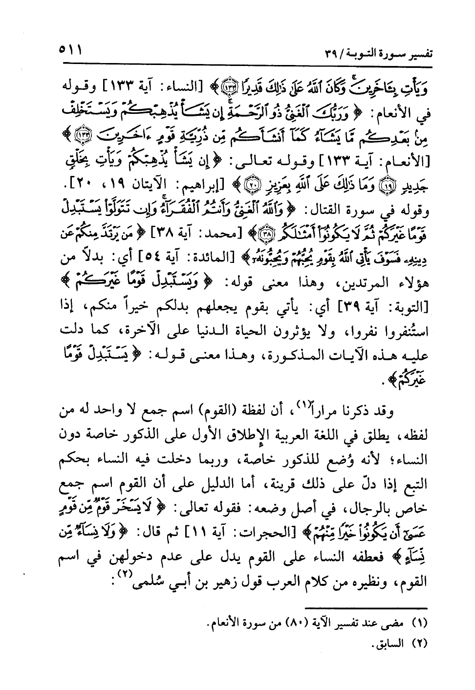 وَيَأْتِ بِآخَرِينَ وَكَانَ اللَّهُ عَلَى ذَلِكَ قَدِيرًا (133)} [النساء: آية 133] وقولُه في الأنعامِ: {وَرَبُّكَ الْغَنِيُّ ذُو الرَّحْمَةِ إِنْ يَشَأْ يُذْهِبْكُمْ وَيَسْتَخْلِفْ مِنْ بَعْدِكُم مَّا يَشَاءُ كَمَا أَنْشَأَكُم مِّنْ ذُرِّيَّةِ قَوْمٍ آخَرِينَ (133)} [الأنعام: آية 133] وقولُه تعالى: {إِنْ يَشَأْ يُذْهِبْكُمْ وَيَأْتِ بِخَلْقٍ جَدِيدٍ (19) وَمَا ذَلِكَ عَلَى اللَّهِ بِعَزِيزٍ (20)} [إبراهيم: الآيتانِ 19، 20]. وقولُه في سورةِ القتالِ: {وَاللَّهُ الْغَنِيُّ وَأَنْتُمُ الْفُقَرَاءُ وَإِنْ تَتَوَلَّوْا يَسْتَبْدِلْ قَوْمًا غَيْرَكُمْ ثُمَّ لاَ يَكُونُوا أَمْثَالَكُمْ} [محمد: آية 38] {مَنْ يَرْتَدَّ مِنْكُمْ عَنْ دِينِهِ فَسَوْفَ يَأْتِي اللَّهُ بِقَوْمٍ يُحِبُّهُمْ وَيُحِبُّونَهُ} [المائدة: آية 54] أي: بدلاً من هؤلاء الْمُرْتَدِّينَ، وهذا معنَى قولِه: {وَيَسْتَبْدِلْ قَوْمًا غَيْرَكُمْ} [التوبة: آية 39] أي: يأتِي بقومٍ يجعلُهم بَدَلَكُمْ خَيْرًا منكم، إذا اسْتُنْفِرُوا نَفَرُوا، ولا يُؤْثِرُونَ الحياةَ الدنيا على الآخرةِ، كما دَلَّتْ عليه هذه الآياتُ المذكورةُ، وهذا معنَى قولِه: {يَسْتَبْدِلْ قَوْمًا غَيْرَكُمْ}.