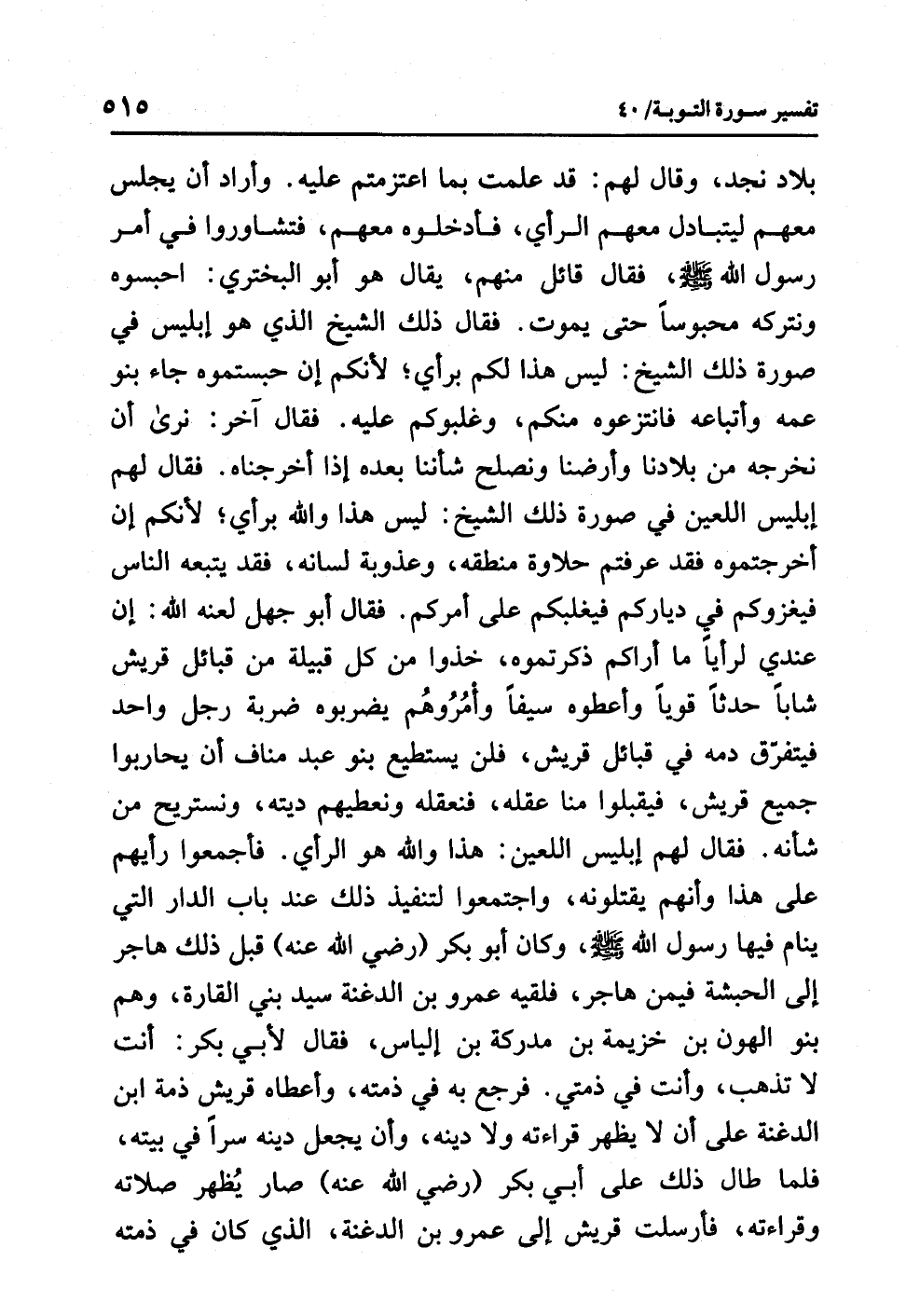 فقال أبو جهلٍ لَعَنَهُ اللَّهُ: إن عندي لَرَأْيًا ما أراكم ذَكَرْتُمُوهُ، خُذُوا من كُلِّ قبيلةٍ من قبائلِ قريشٍ شابًّا حدثًا قويًّا وَأَعْطُوهُ سَيْفًا وأْمُرُوهُمْ يضربوه ضربةَ رجلٍ واحدٍ فَيَتَفَرَّقُ دَمُهُ في قبائلِ قريشٍ، فلن يستطيعَ بَنُو عبدِ منافٍ أن يُحَارِبُوا جميعَ قريشٍ، فيقبلوا منا عقلَه، فنعقلَه ونعطيَهم دِيَتَهُ، ونستريحَ من شَأْنِهِ. فقال لهم إبليسُ اللعينُ: هذا وَاللَّهِ هو الرأيُ. فَأَجْمَعُوا رأيَهم على هذا وأنهم يقتلونَه، واجتمعوا لتنفيذِ ذلك عندَ بابِ الدارِ التي ينامُ فيها رسولُ اللَّهِ صلى الله عليه وسلم، وكان أَبْو بَكْرٍ (رضي الله عنه) قبلَ ذلك هَاجَرَ إلى الحبشةِ فِيمَنْ هَاجَرَ، فَلَقِيَهُ عمرُو بنُ الدغنةِ سيدُ بَنِي القارةِ، وهم بنو الهونِ بنِ خزيمةَ بنِ مدركةَ بنِ إلياسَ، فقال لأبِي بكرٍ: أنتَ لاَ تذهبُ، وأنتَ فِي ذِمَّتِي. فرجع به في ذمتِه، وَأَعْطَاهُ قريشٌ ذمةَ ابنِ الدغنةِ على أن لا يُظْهِرَ قراءتَه ولا دِينَهُ، وأن يجعلَ دينَه سِرًّا في بيتِه، فلما طال ذلك على أبي بكرٍ (رضي الله عنه) صار يُظْهِرُ صلاتَه وقراءتَه، فَأَرْسَلَتْ قريشٌ إلى عمرِو بنِ الدغنةِ، الذي كان في ذمتِه