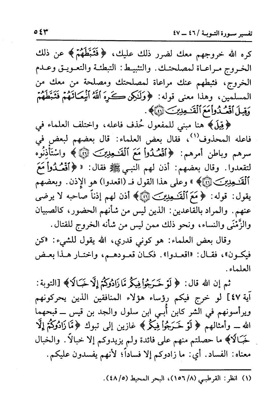 كَرِهَ اللَّهُ خروجَهم معكَ لضررِ ذلك عليكَ، {فَثَبَّطَهُمْ} عن ذلك الخروجِ مراعاةً لمصلحتكَ. والتثبيطُ: التبطئةُ والتعويقُ وعدمُ الخروجِ، فَثَبَّطَهُمْ عنكَ مراعاةً لمصلحتكَ ومصلحةِ مَنْ مَعَكَ مِنَ المسلمينَ، وهذا معنَى قولِه: {وَلَكِنْ كَرِهَ اللَّهُ انْبِعَاثَهُمْ فَثَبَّطَهُمْ وَقِيلَ اقْعُدُوا مَعَ الْقَاعِدِينَ}.
