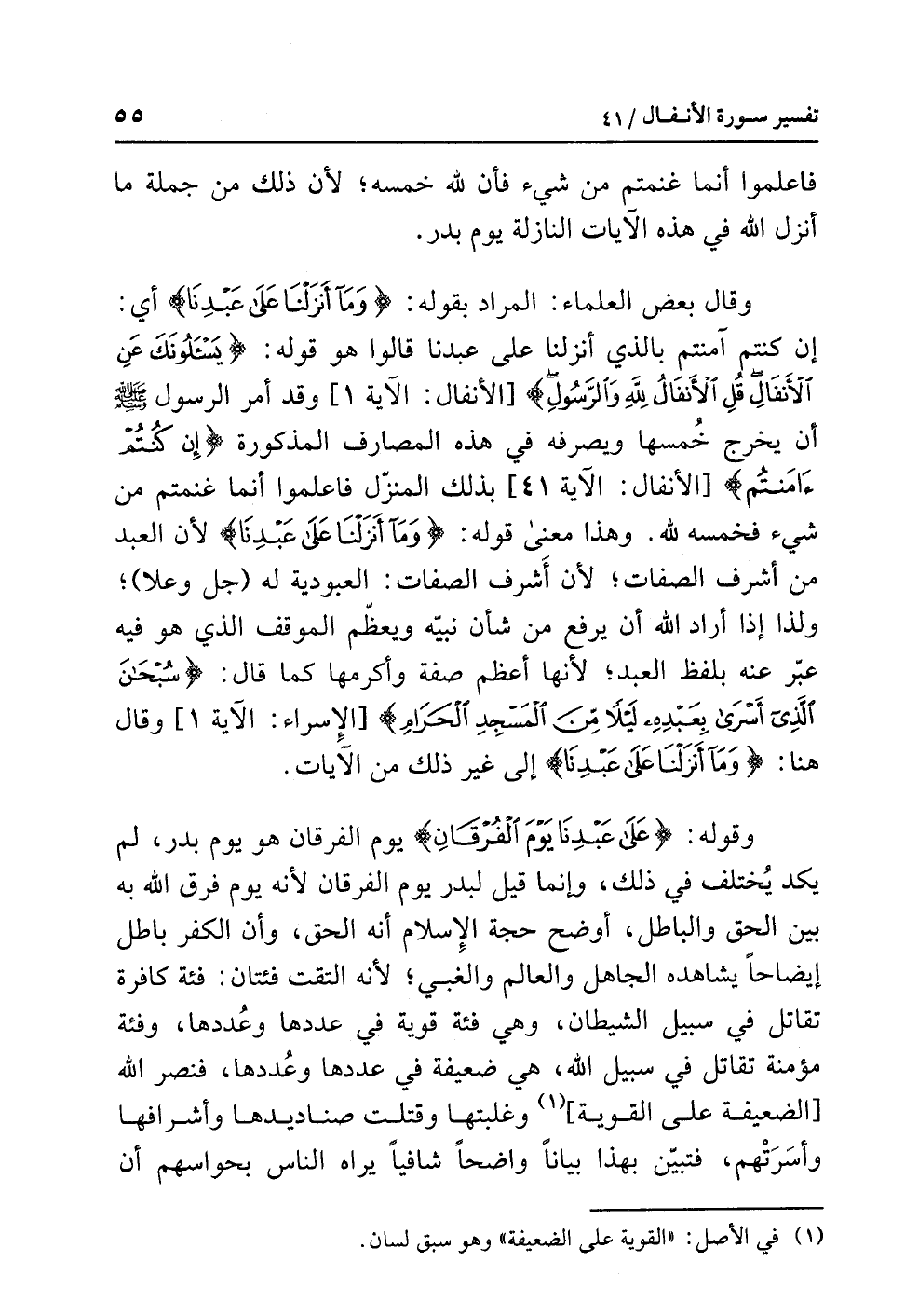 وقال بعض العلماء: المراد بقوله: {وَمَا أَنزَلْنَا عَلَى عَبْدِنَا} أي: إن كنتم آمنتم بالذي أنزلنا على عبدنا قالوا هو قوله: {يَسْأَلُونَكَ عَنِ الأَنفَالِ قُلِ الأَنفَالُ لِلَّهِ وَالرَّسُولِ} [الأنفال: الآية 1] وقد أمر الرسول صلى الله عليه وسلم أن يخرج خمُسها ويصرفه في هذه المصارف المذكورة {إِن كُنتُمْ آمَنتُمْ} [الأنفال: الآية 41] بذلك المنزّل فاعْلَموا أنما غنمتم من شيء فخمسه لله. وهذا معنى قوله: {وَمَا أَنزَلْنَا عَلَى عَبْدِنَا} لأن العبد من أشْرَف الصفات؛ لأن أَشرف الصفات: العبودية له (جل وعلا)؛ ولذا إذا أراد الله أن يرفع من شأن نبيّه ويعظّم الموقف الذي هو فيه عَبَّرَ عَنْهُ بِلَفْظِ العَبْدِ؛ لأنها أعْظَم صفة وأكرمها كما قال: {سُبْحَانَ الَّذِي أَسْرَى بِعَبْدِهِ لَيْلاً مِّنَ الْمَسْجِدِ الْحَرَامِ} [الإسراء: الآية 1] وقال هنا: {وَمَا أَنزَلْنَا عَلَى عَبْدِنَا} إلى غير ذلك من الآيات.