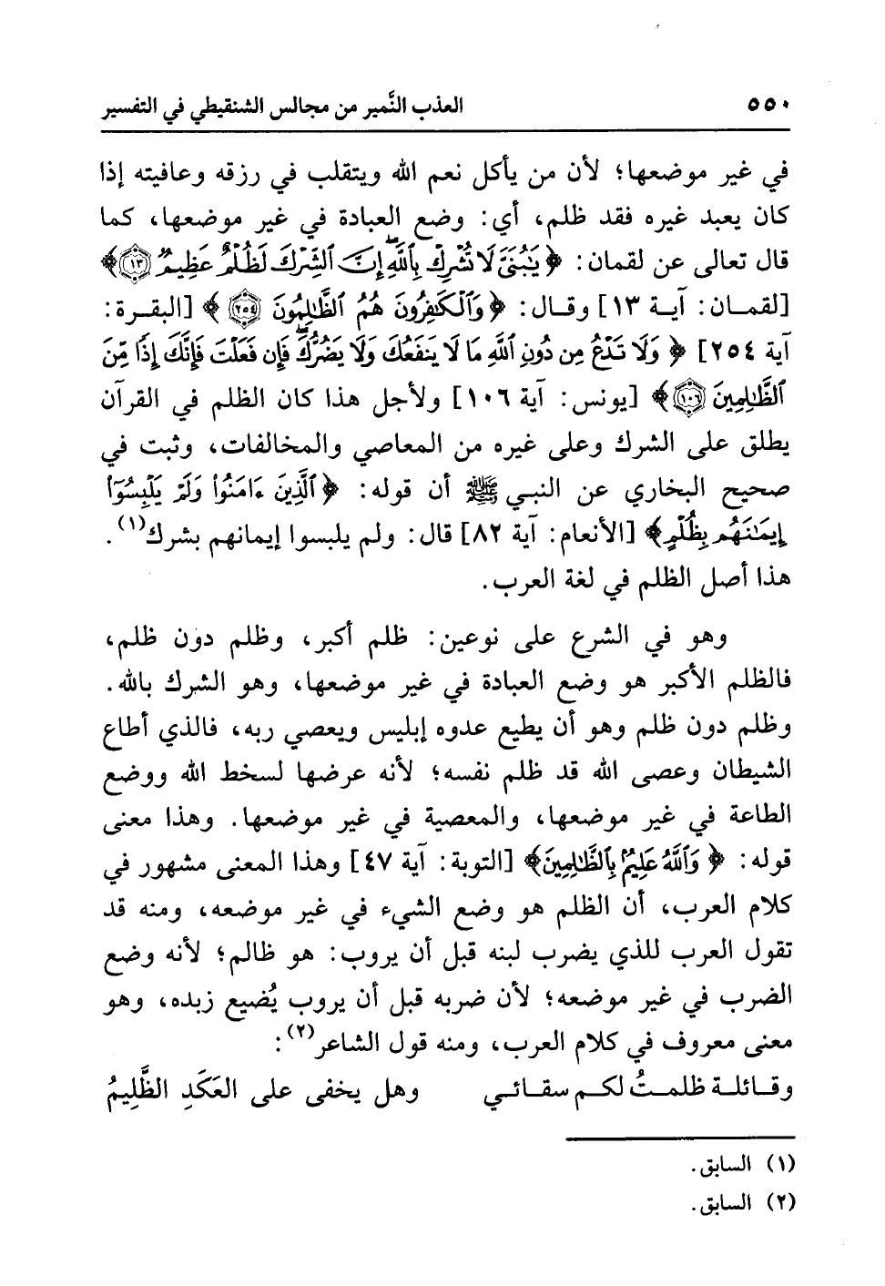 في غيرِ موضعِها؛ لأَنَّ مَنْ يأكلُ نِعَمَ اللَّهِ ويتقلبُ في رِزْقِهِ وعافيتِه إذا كان يعبدُ غيرَه فقد ظَلَمَ، أي: وَضَعَ العبادةَ في غيرِ موضعِها، كما قال تعالَى عن لقمانَ: {يَا بُنَيَّ لاَ تُشْرِكْ بِاللَّهِ إِنَّ الشِّرْكَ لَظُلْمٌ عَظِيمٌ} [لقمان: آية 13] وقال: {وَالْكَافِرُونَ هُمُ الظَّالِمُونَ} [البقرة: آية 254] {وَلاَ تَدْعُ مِنْ دُونِ اللَّهِ مَا لاَ يَنْفَعُكَ وَلاَ يَضُرُّكَ فَإِنْ فَعَلْتَ فَإِنَّكَ إِذًا مِّنَ الظَّالِمِينَ (106)} [يونس: آية 106] ولأَجْلِ هذا كان الظلمُ في القرآنِ يُطْلَقُ على الشركِ وعلى غيرِه من المعاصِي والمخالفاتِ، وَثَبَتَ في صحيحِ البخاريِّ عن النبيِّ صلى الله عليه وسلم أن قولَه: {الَّذِينَ آمَنُوا وَلَمْ يَلْبِسُوا إِيمَانَهُمْ بِظُلْمٍ} [الأنعام: آية 82] قال: ولم يَلْبِسُوا إيمانَهم بِشِرْكٍ (¬1). هذا أصلُ الظلم في لغةِ العربِ.