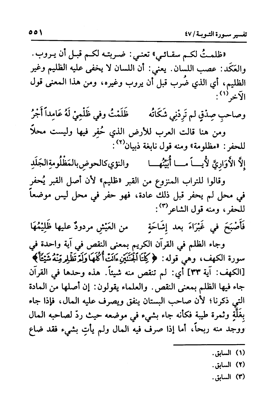 ومن هنا قالت العربُ للأرضِ الذي حُفِرَ فيها وليست محلاًّ للحفرِ: «مظلومةٌ» ومنه قولُ نابغةِ ذبيانَ (¬2):