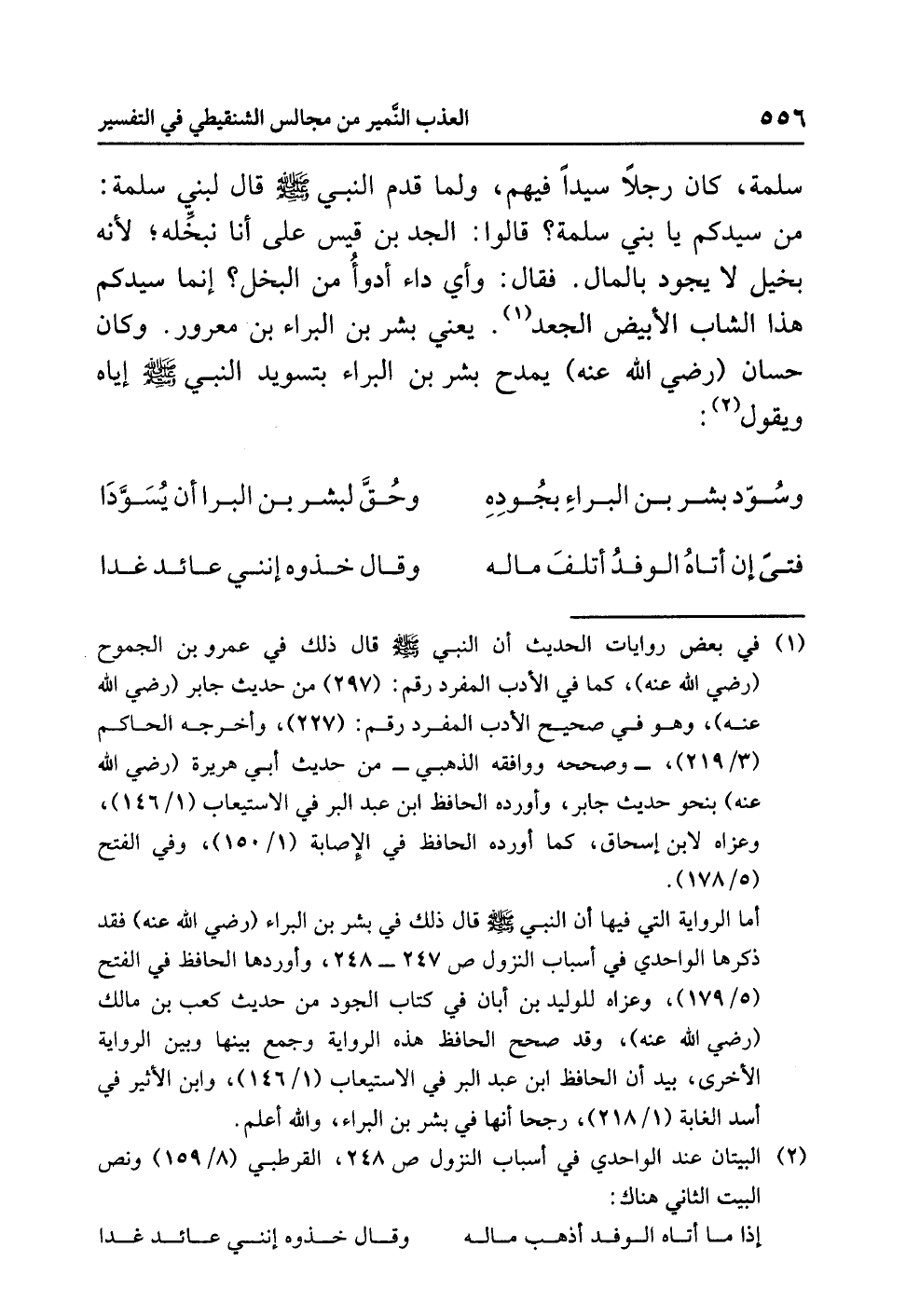 وَسُوِّدَ بِشْرُ بْنُ الْبَرَاءِ بِجُودِهِ ... وَحُقَّ لِبِشْرِ بْنِ الْبَرَا أَنْ يُسَوَّدَا