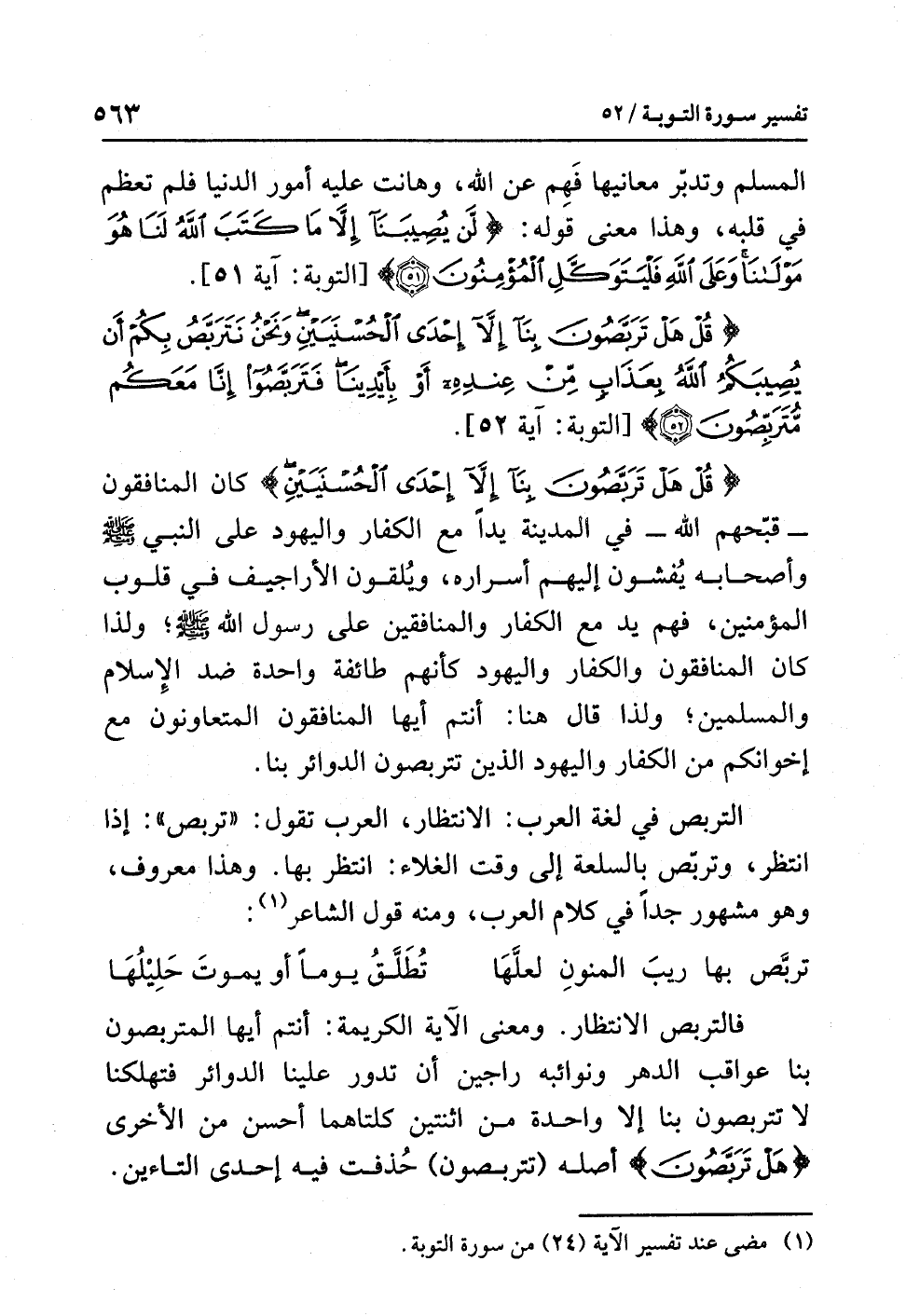 {قُلْ هَلْ تَرَبَّصُونَ بِنَا إِلاَّ إِحْدَى الْحُسْنَيَيْنِ وَنَحْنُ نَتَرَبَّصُ بِكُمْ أَنْ يُصِيبَكُمُ اللَّهُ بِعَذَابٍ مِّنْ عِنْدِهِ أَوْ بِأَيْدِينَا فَتَرَبَّصُوا إِنَّا مَعَكُم مُّتَرَبِّصُونَ (52)} [التوبة: آية 52].