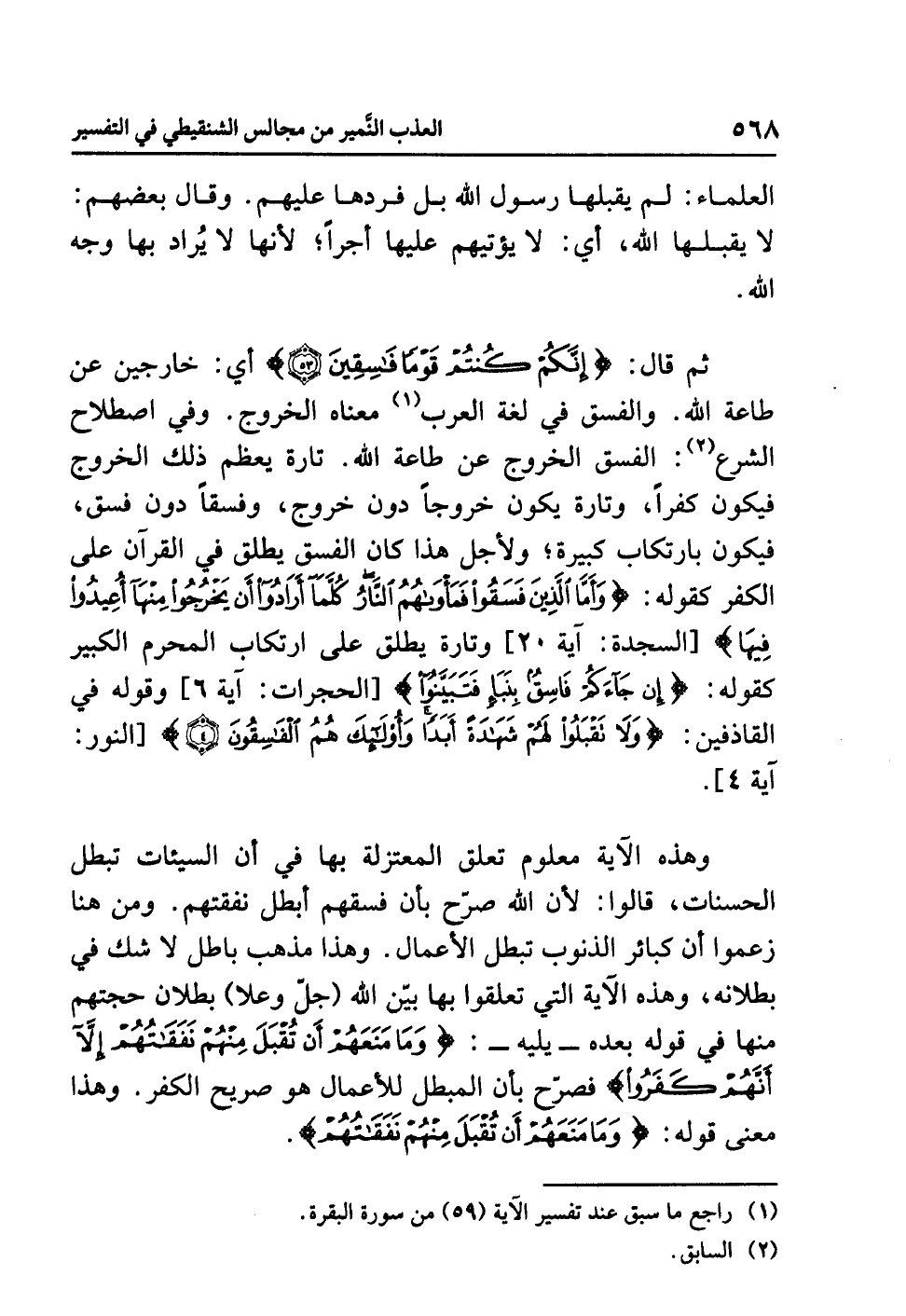 وهذه الآيةُ معلومٌ تعلقُ المعتزلةِ بها في أن السيئاتِ تُبْطِلُ الحسناتِ، قالوا: لأن اللَّهَ صَرَّحَ بأن فسقَهم أَبْطَلَ نفقتَهم. وَمِنْ هنا زَعَمُوا أن كبائرَ الذنوبِ تُبْطِلُ الأعمالَ. وهذا مذهبٌ باطلٌ لا شَكَّ في بُطْلاَنِهِ، وهذه الآيةُ التي تَعَلَّقُوا بها بَيَّنَ اللَّهُ (جلَّ وعلا) بُطْلاَنَ حجتِهم منها في قولِه بعدَه - يليه -: {وَمَا مَنَعَهُمْ أَنْ تُقْبَلَ مِنْهُمْ نَفَقَاتُهُمْ إِلاَّ أَنَّهُمْ كَفَرُوا} فَصَرَّحَ بأن المبطلَ للأعمالِ هو صريحُ الكفرِ. وهذا معنَى قولِه: {وَمَا مَنَعَهُمْ أَنْ تُقْبَلَ مِنْهُمْ نَفَقَاتُهُمْ}.