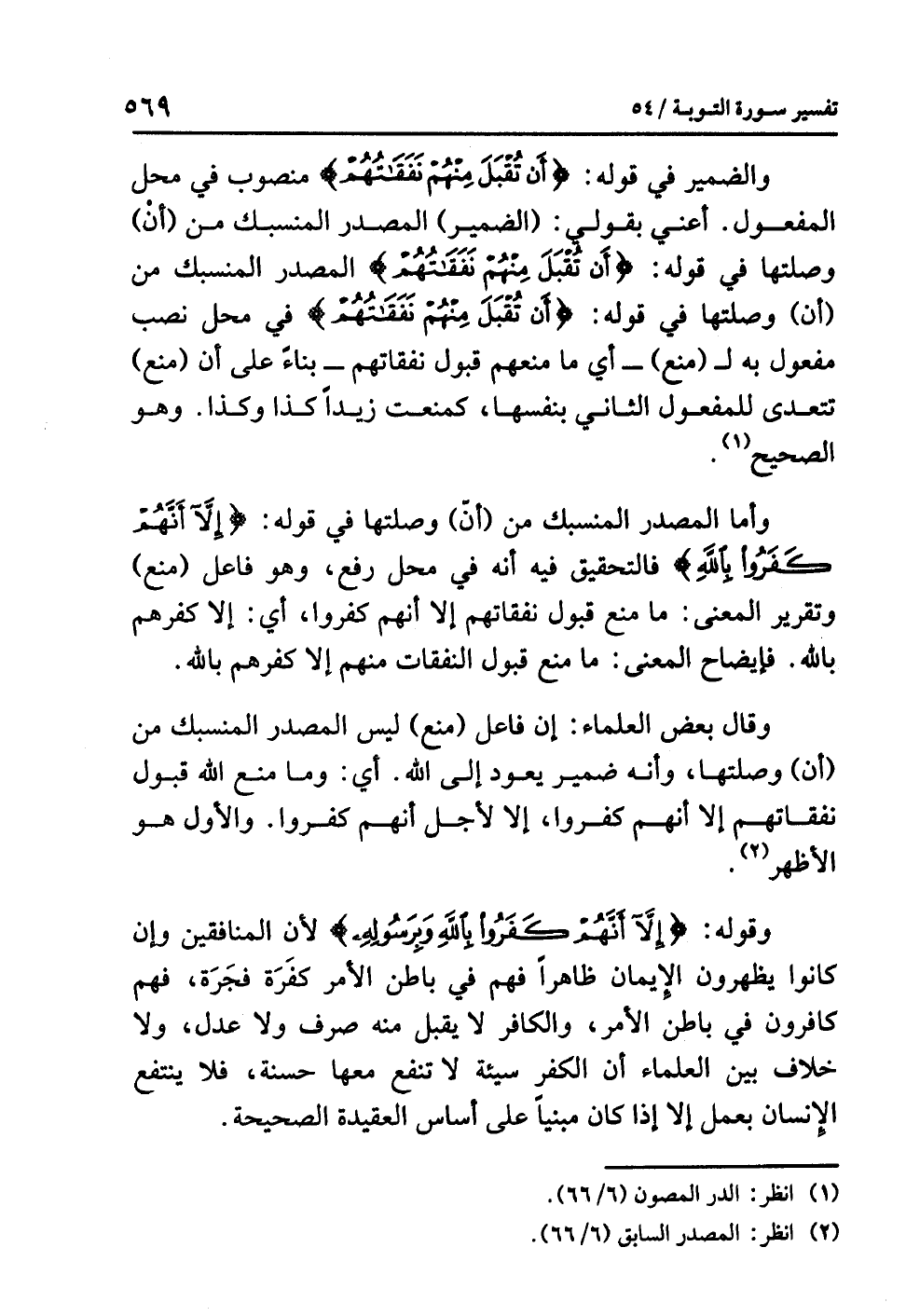 وأما المصدرُ المنسبكُ من (أن) وصلتِها في قولِه: {إِلاَّ أَنَّهُمْ كَفَرُوا بِاللَّهِ} فالتحقيقُ فيه أنه في محلِّ رفعٍ، وهو فاعلُ (مَنَعَ) وتقريرُ المعنَى: ما منعَ قبولَ نفقاتِهم إلا أنهم كفروا، أي: إلا كفرُهم بالله. فإيضاحُ المعنَى: ما مَنَعَ قبولَ النفقاتِ منهم إلا كفرُهم بِاللَّهِ.