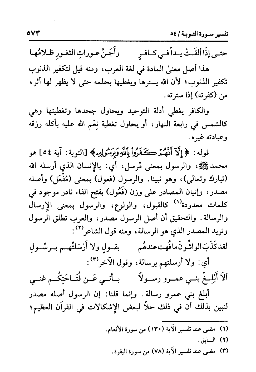 قولُه: {إِلاَّ أَنَّهُمْ كَفَرُوا بِاللَّهِ وَبِرَسُولِهِ} [التوبة: آية 54] هو محمدٌ صلى الله عليه وسلم، والرسولُ بِمَعْنَى مُرْسَلٍ، أي: بالإنسانِ الذي أَرْسَلَهُ اللَّهُ (تبارك وتعالى)، وهو نَبِيُّنَا. والرسولُ (فعول) بمعنَى (مُفْعَلٍ) وأصلُه مصدرٌ، وإتيانُ المصادرِ على وزنِ (فَعُول) بفتحِ الفاءِ نادرٌ موجودٌ في كلماتٍ معدودةٍ (¬1) كالقبولِ، والولوعِ، والرسولُ بمعنَى الإرسالِ والرسالةِ. والتحقيقُ أن أصلَ الرسولِ مصدرٌ، والعربُ تُطْلِقُ الرسولَ وتريدُ المصدرَ الذي هو الرسالةُ، ومنه قولُ الشاعرِ (¬2):