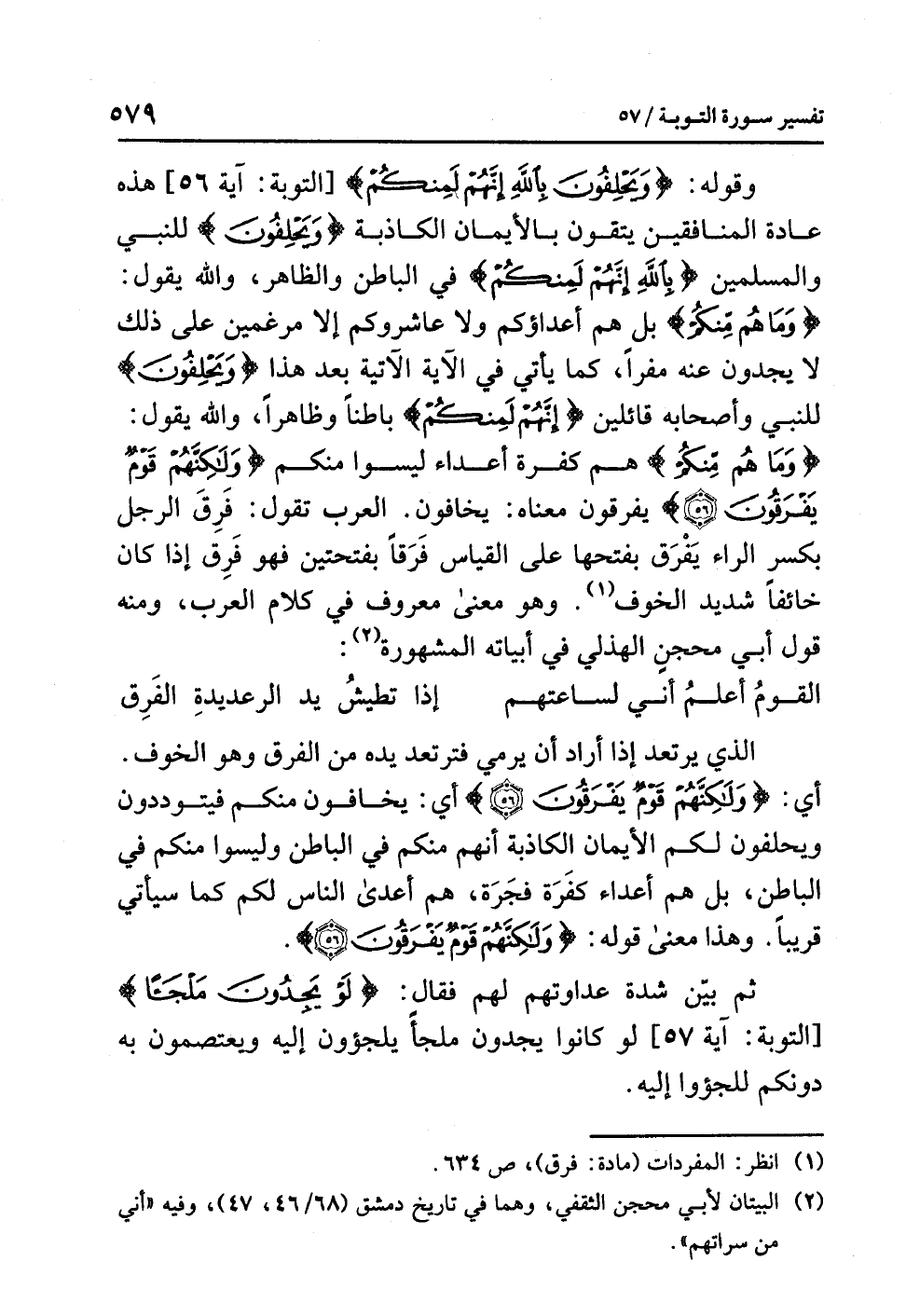 وقولُه: {وَيَحْلِفُونَ بِاللَّهِ إِنَّهُمْ لَمِنْكُمْ} [التوبة: آية 56] هذه عادةُ المنافقينَ يتقونَ بِالأَيْمَانِ الكاذبةِ {وَيَحْلِفُونَ} للنبيِّ والمسلمينَ {بِاللَّهِ إِنَّهُمْ لَمِنْكُمْ} في الباطنِ والظاهرِ، وَاللَّهُ يقولُ: {وَمَا هُم مِّنْكُمْ} بل هم أعداؤُكم ولا عَاشَرُوكُمْ إلا مُرْغَمِينَ على ذلك لاَ يجدونَ عنه مَفَرًّا، كما يأتِي في الآيةِ الآتيةِ بعدَ هذا {وَيَحْلِفُونَ} للنبيِّ وأصحابِه قائلينَ {إِنَّهُمْ لَمِنْكُمْ} بَاطِنًا وَظَاهِرًا، وَاللَّهُ يقولُ: {وَمَا هُم مِّنْكُمْ} هم كفرةٌ أعداءُ ليسوا منكم {وَلَكِنَّهُمْ قَوْمٌ يَفْرَقُونَ} يَفْرَقُونَ معناه: يَخَافُونَ. العربُ تقولُ: فَرِقَ الرجلُ بكسرِ الراءِ يَفْرَقُ بفتحِها على القياسِ فَرَقًا بفتحتينِ فهو فَرِقَ إذا كان خَائِفًا شديدَ الخوفِ (¬1). وهو معنًى معروفٌ في كلامِ العربِ، ومنه قولُ أبِي مِحْجَنٍ الهذليِّ في أبياتِه المشهورةِ (¬2):