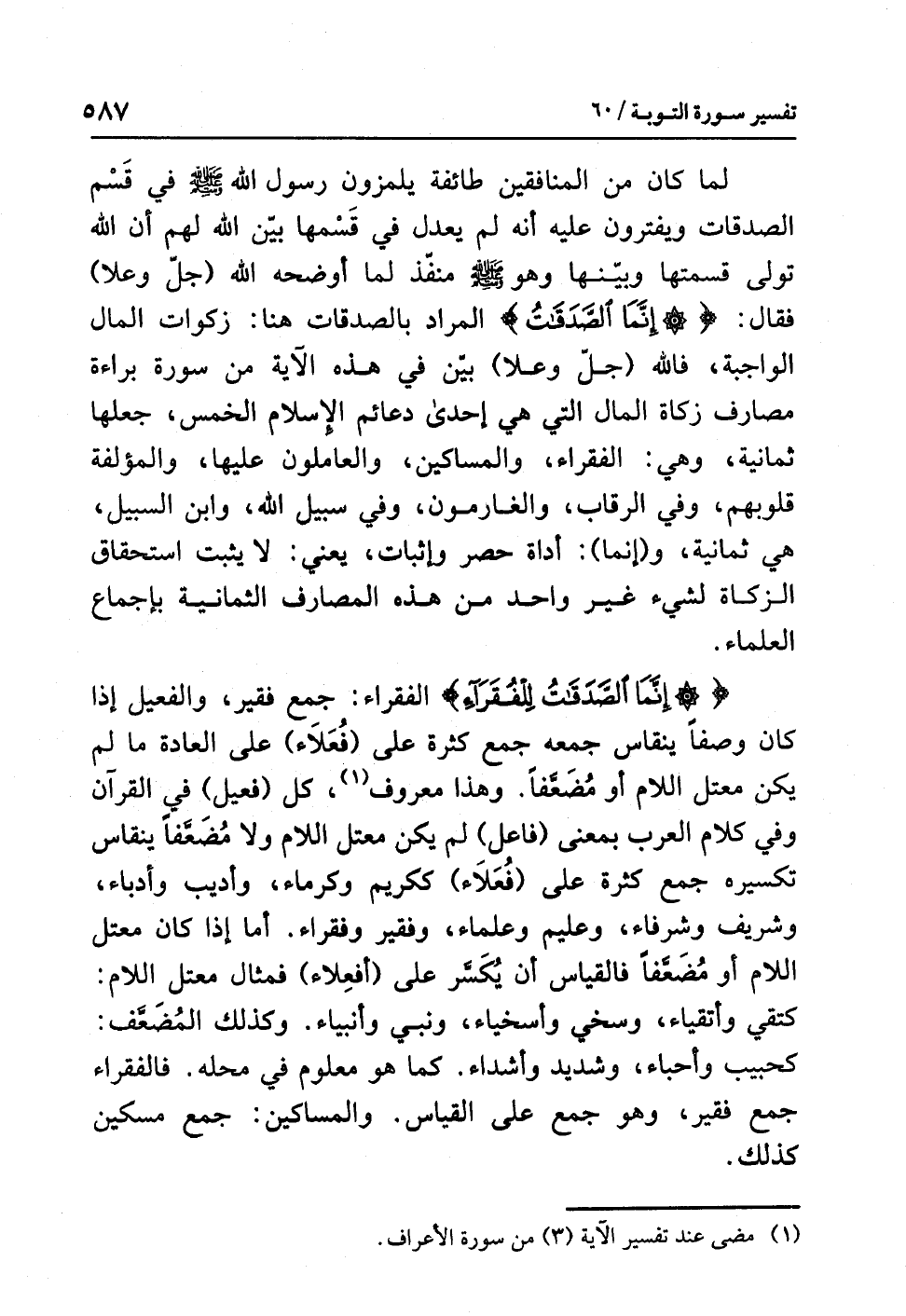 {إِنَّمَا الصَّدَقَاتُ لِلْفُقَرَاءِ} الفقراءُ: جَمْعُ فقيرٍ، والفعيلُ إذا كان وَصْفًا ينقاسُ جمعُه جمعَ كثرةٍ على (فُعَلاَءَ) على العادةِ ما لم يكن معتلَّ اللامِ أو مُضَعَّفًا. وهذا معروفٌ (¬1)، كُلُّ (فعيلٍ) في القرآنِ وفي كلامِ العربِ بمعنَى (فاعلٍ) لم يكن معتلَّ اللامِ ولا مُضَعَّفًا ينقاسُ تكسيرُه جمعُ كثرةٍ على (فُعَلاَءَ) ككريمٍ وكرماءَ، وأديبٍ وأدباءَ، وشريفٍ وشرفاءَ، وعليمٍ وعلماءَ، وفقيرٍ وفقراءَ. أما إذا كان معتلَّ اللامِ أو مُضَعَّفًا فالقياسُ أن يُكَسَّرَ على (أَفْعِلاَءَ) فمثالُ معتلِّ اللامِ: كَتَقِيٍّ وأتقياءَ، وَسَخِيٍّ وأسخياءَ، وَنَبِيٍّ وأنبياءَ. وكذلك الْمُضَعَّفُ: كحبيبٍ وأحباءَ، وشديدٍ وأشداءَ. كما هو معلومٌ في محلِّه. فالفقراءُ جمعُ فقيرٍ، وهو جَمْعٌ على القياسِ. والمساكينُ: جَمْعُ مسكينٍ كذلك.