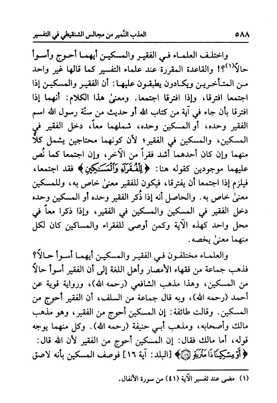 واختلفَ العلماءُ في الفقيرِ والمسكينِ أيهما أحوجُ وأسوأُ حالاً (¬1)؟! والقاعدةُ المقررةُ عند علماءِ التفسيرِ كما قَالَهَا غيرُ واحدٍ من المتأخرينَ ويكادونَ يُطْبِقُونَ عليها: أن الفقيرَ والمسكينَ إذا اجْتَمَعَا افْتَرَقَا، وإذا افْتَرَقَا اجْتَمَعَا. ومعنَى هذا الكلامِ: أنهما إذا افْتَرَقَا بأن جاءَ في آيةٍ من كتابِ اللَّهِ أو حديثٍ من سُنَّةِ رسولِ اللَّهِ اسمُ الفقيرِ وحدَه، أو المسكينِ وحدَه، شَمِلَهُمَا معًا، دخلَ الفقيرُ في المسكينِ، والمسكينُ في الفقيرِ؛ لأَنَّ كونَهما مُحْتَاجَيْنِ يشمل كُلاًّ منهما وإن كان أحدُهما أَشَدَّ فقرًا من الآخَرِ، وإن اجْتَمَعَا كما نُصَّ عليهما موجودينِ كقولِه هنا: {لِلْفُقَرَاءِ وَالْمَسَاكِينِ} فقد اجْتَمَعَا، فيلزمُ إذا اجتمعا أن يفترقَا، فيكونُ للفقيرِ معنًى خاصٌّ به، وللمسكينِ معنًى خاصٌّ به. والحاصلُ أنه إذا ذُكِرَ الفقيرُ وحدَه أو المسكينُ وحدَه دَخَلَ الفقيرُ في المسكينِ والمسكينُ في الفقيرِ، وإذا ذُكِرَا معًا في مَحَلٍّ واحدٍ كهذِه الآيةِ وَكَمَنْ أَوْصَى للفقراءِ والمساكينِ كان لكلٍّ منهما مَعْنًى يَخُصُّهُ.