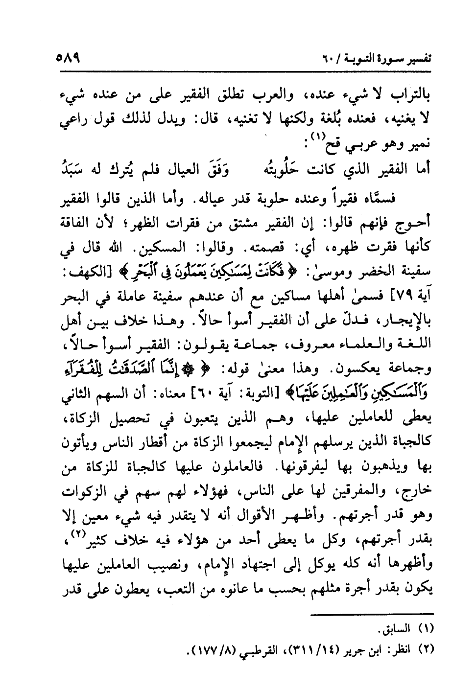 فَسَمَّاهُ فقيرًا وعندَه حلوبةٌ قدرَ عيالِه. وأما الذين قالوا: الفقيرُ أحوجُ فإنهم قالوا: إن الفقيرَ مُشْتَقٌّ من فقراتِ الظهرِ؛ لأَنَّ الفاقةَ كأنها فَقَرَتْ ظَهْرَهُ، أي: قَصَمَتْهُ. وقالوا: المسكينُ: اللَّهُ قال في سفينةِ الخضرِ وموسى: {فَكَانَتْ لِمَسَاكِينَ يَعْمَلُونَ فِي الْبَحْرِ} [الكهف: آية 79] فَسَمَّى أهلَها مساكينَ مع أن عندَهم سفينةً عاملةً في البحرِ بالإيجارِ، فَدَلَّ على أن الفقيرَ أسوأُ حالاً. وهذا خلافٌ بَيْنَ أهلِ اللغةِ والعلماءِ معروفٌ، جماعةٌ يقولونَ: الفقيرُ أسوأُ حالاً، وجماعةٌ يعكسونَ. وهذا معنَى قولِه: {إِنَّمَا الصَّدَقَاتُ لِلْفُقَرَاءِ وَالْمَسَاكِينِ}.